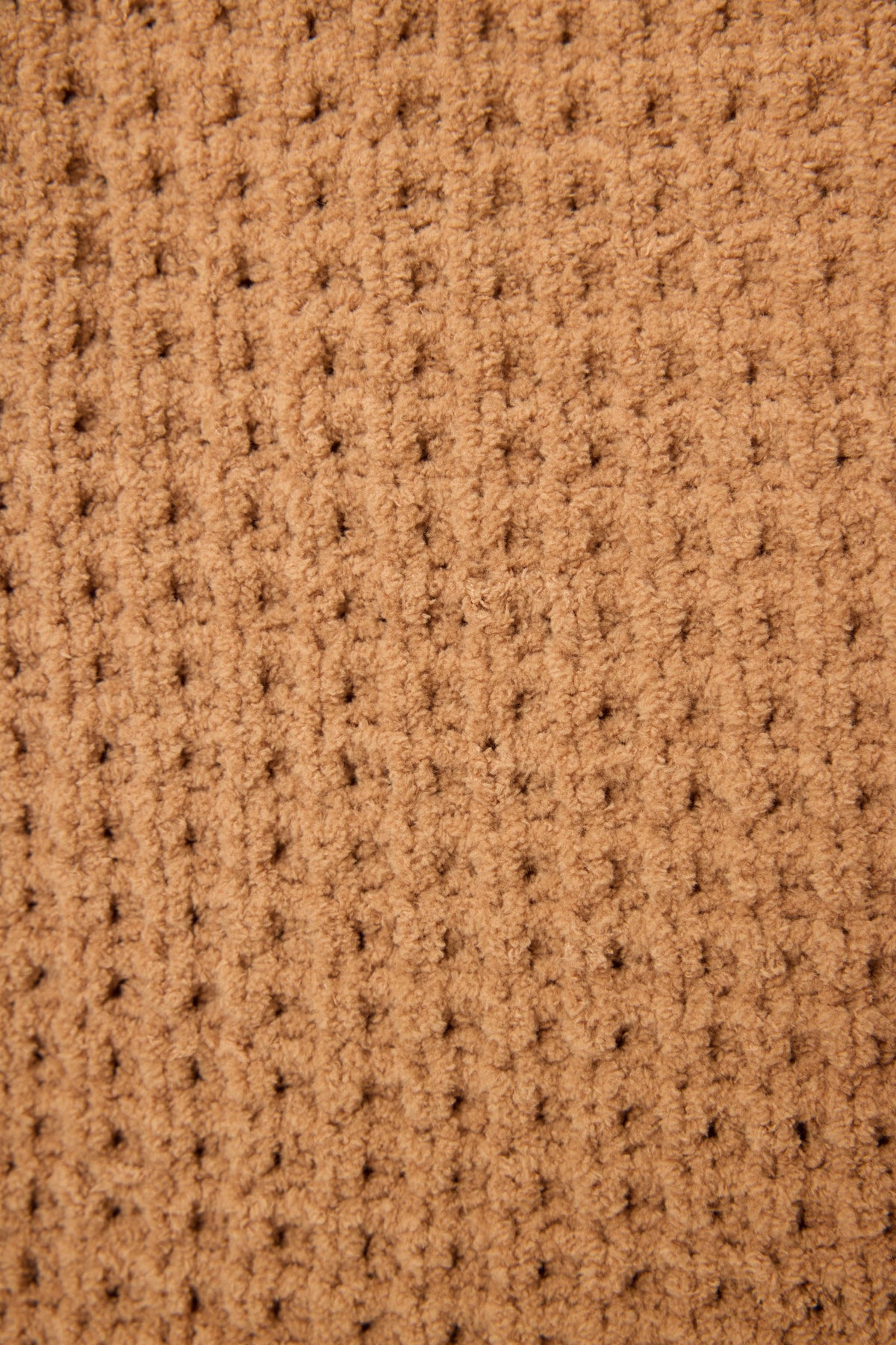 Close-up of the P.J. Salvage Chenille Waffle Caramel Beanie, featuring a textured brown fabric with a waffle pattern and evenly spaced vertical and horizontal ridges.