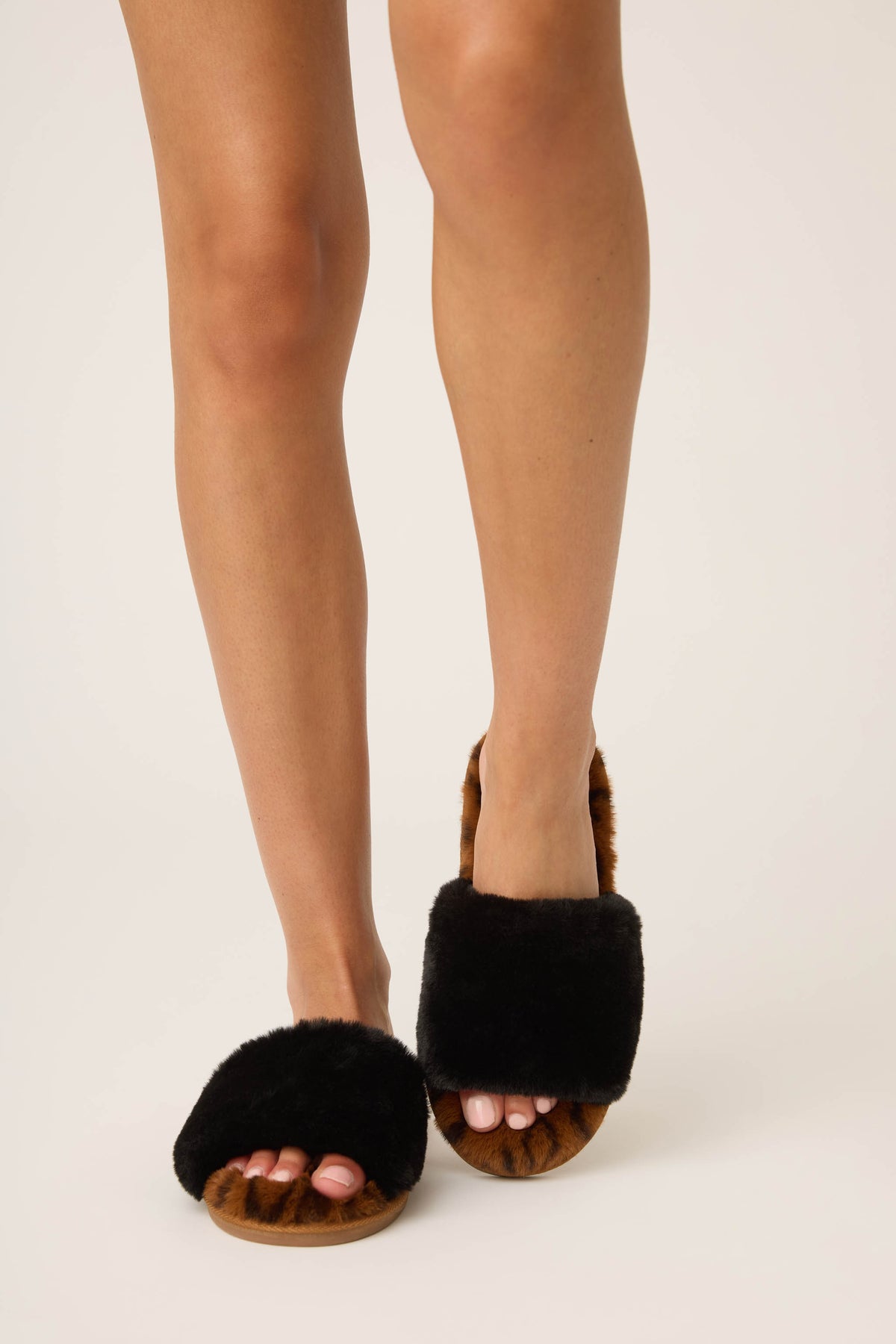 A person wears P.J. Salvage Faux Fur Slides, featuring cushioned brown soles and thick black fuzzy straps, standing barefoot with only their lower legs and feet visible against a plain, light background.
