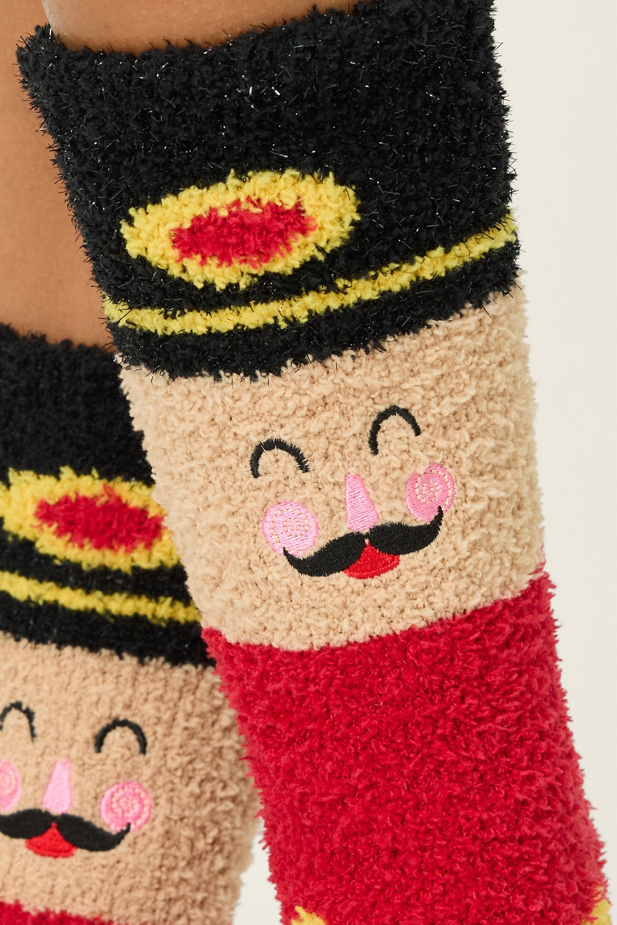 Women’s red fuzzy socks with nutcracker face design, black boots, gold uniform accents, pink cheek detail, and gripper bottoms.