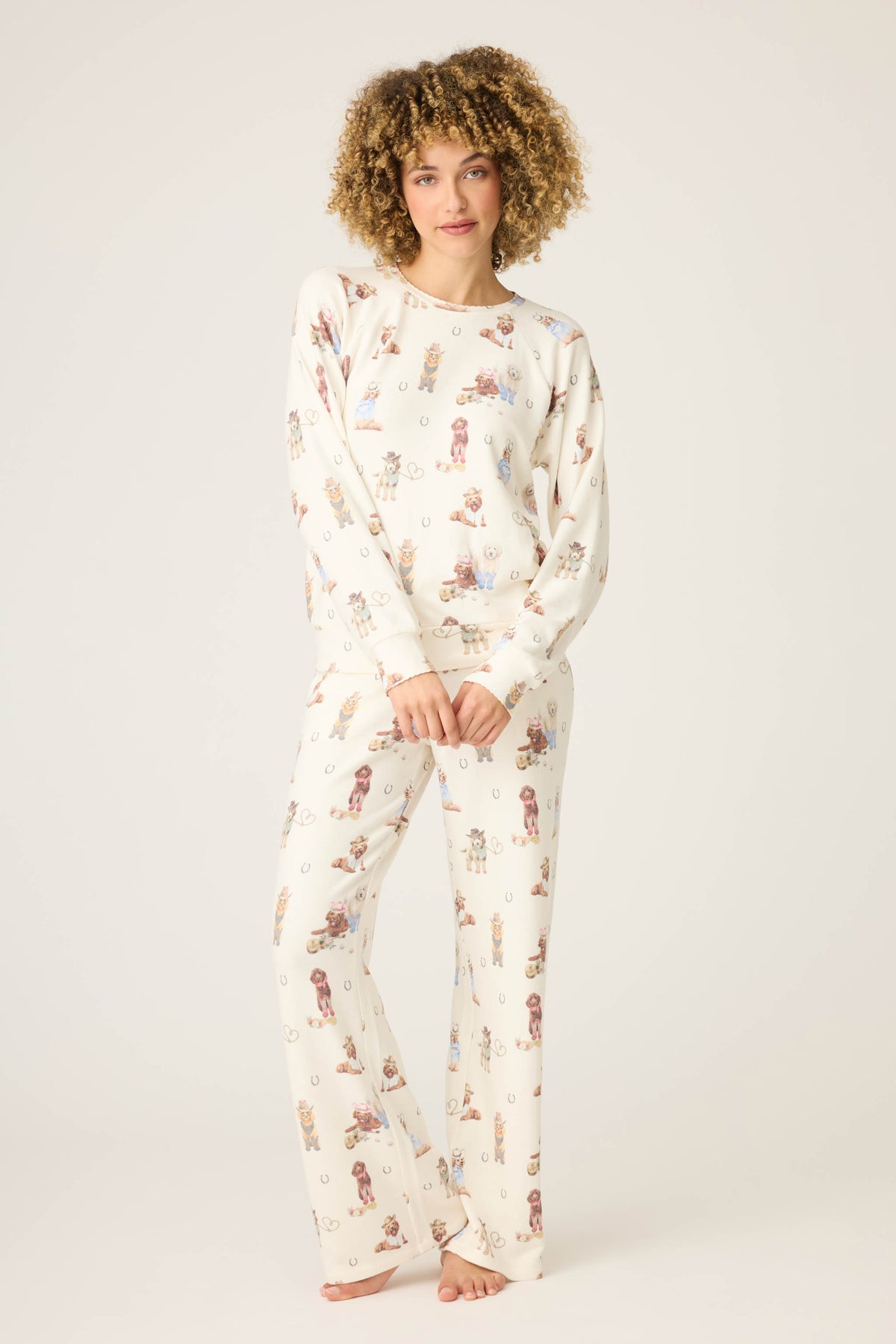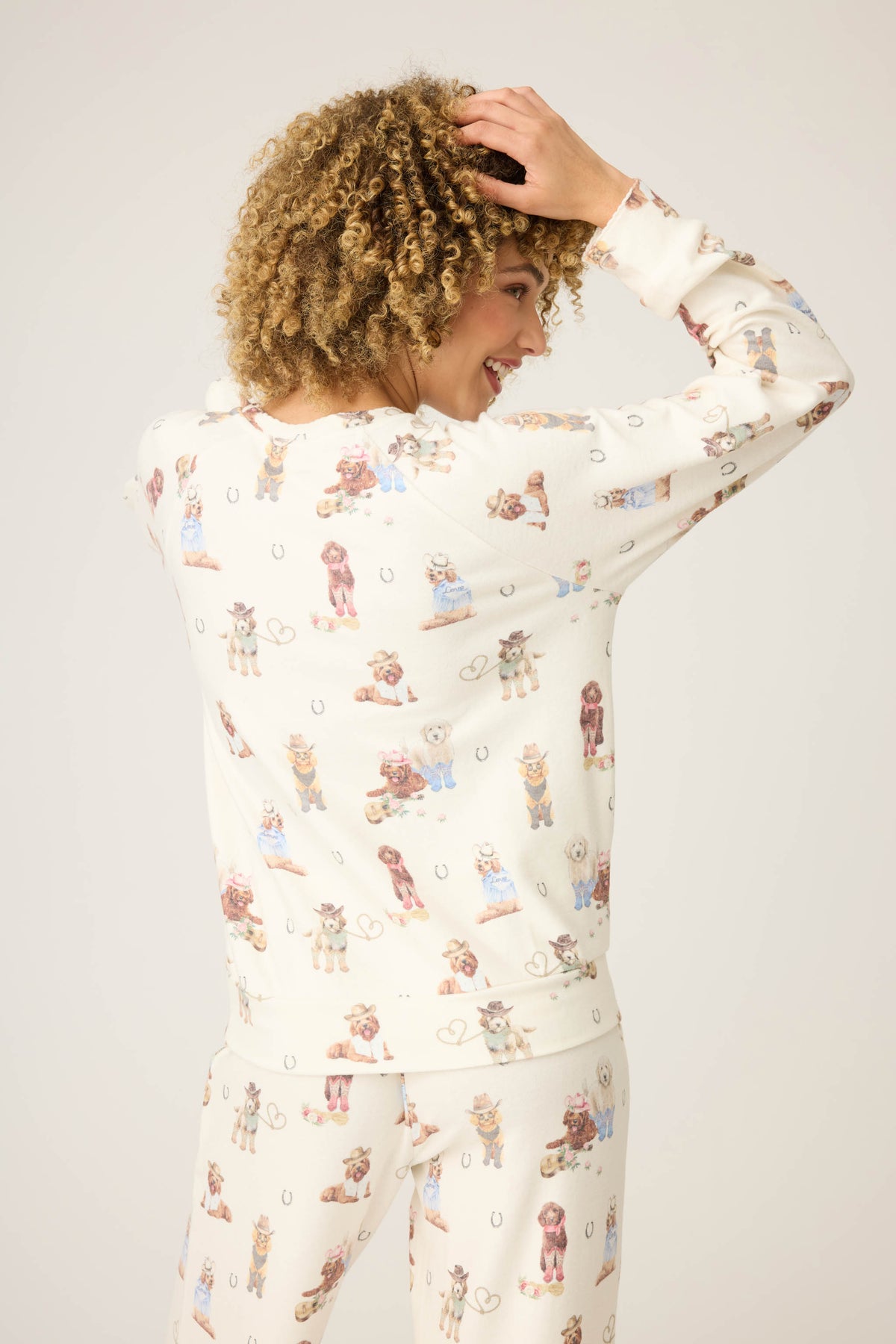 Round up some cozy charm. This ivory long sleeve top—crafted from soft peachy jersey—features a relaxed fit and an allover western dog print with cowboy hats, boots, guitars, horseshoes, and playful pups ready for the rodeo. Perfect for pairing with the matching pants or shorts for a look that’s paws-itively adorable.