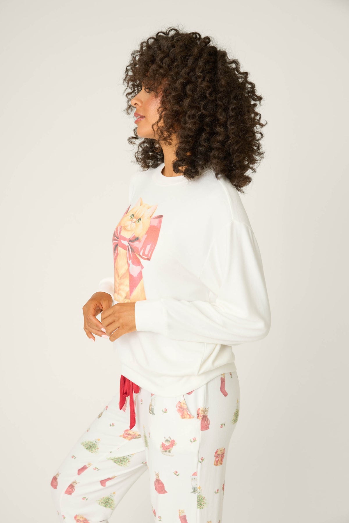 Women’s ivory long sleeve top in peachy jersey with holiday cat graphic, relaxed crewneck fit, and ribbed cuffs and hem.