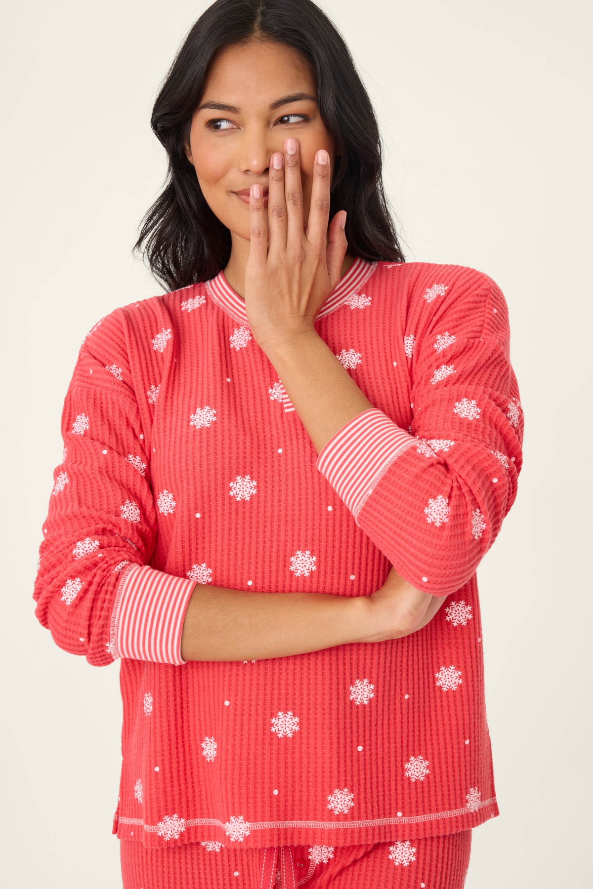 The Ski Jammie Snowflake Print PJ Set by P.J. Salvage features red fabric with a textured, waffle-like pattern and an allover print of evenly spaced white snowflakes and small white dots.