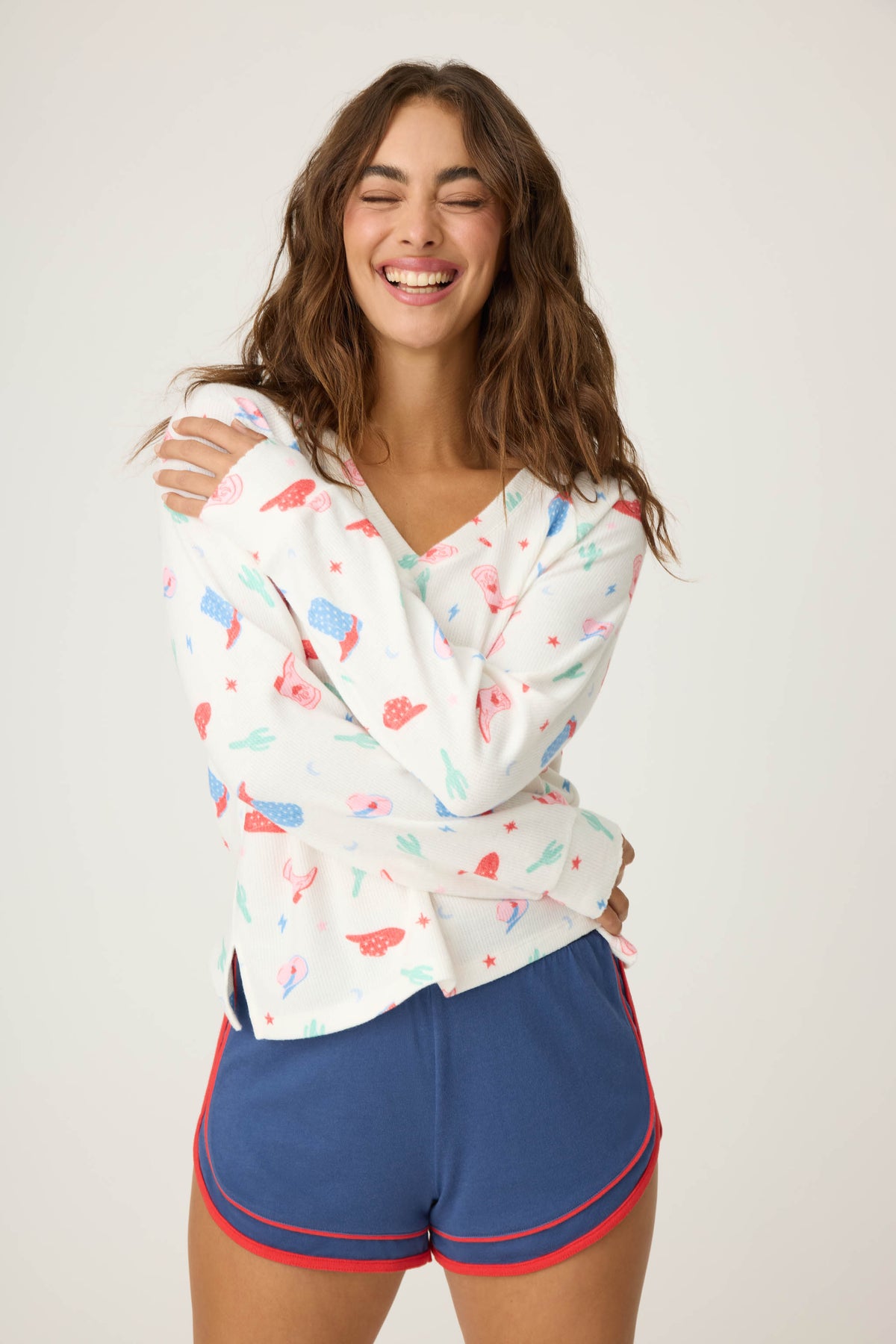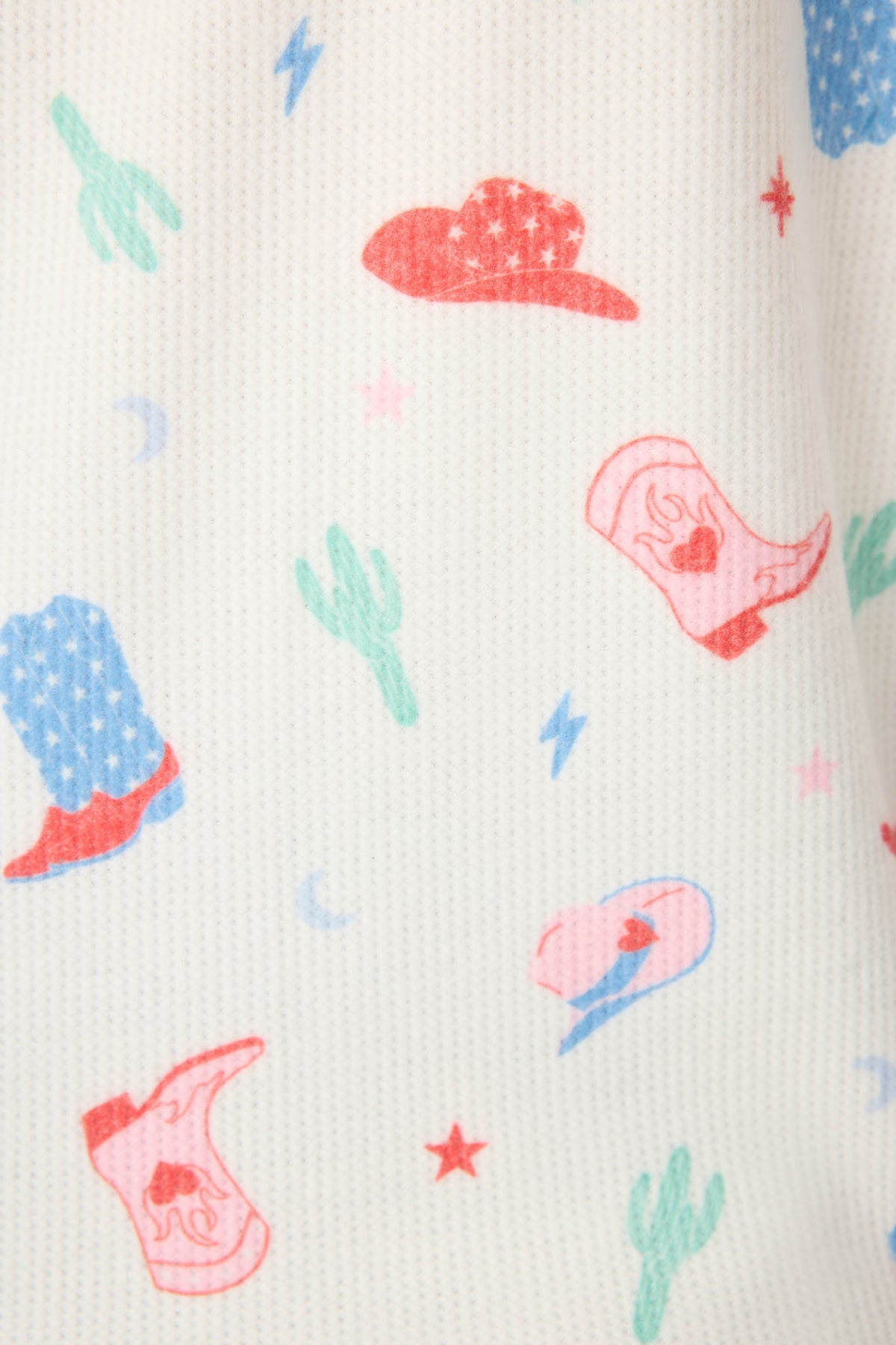 Take a load off from the daily grind in this ivory long‑sleeve top, printed with playful nods to Western Americana—from cacti and saddles to cowboy hats. Crafted from brushed thermal fabric for a cozy feel, its relaxed V‑neck, split hems on both sides, and boxy fit create a breezy silhouette that invites you to kick off your boots and unwind. Perfect for lazy, sun‑drenched afternoons or starry, laid‑back nights.