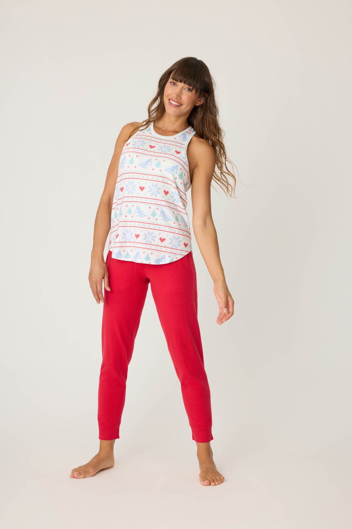 Après ski style is yours with this pajama tank featuring a fun ski-themed pattern, adding a playful winter touch to your sleepwear collection. Made from soft peachy fabric, it’s perfect for staying comfortable whether you're lounging or getting ready for a cozy winter night's sleep.