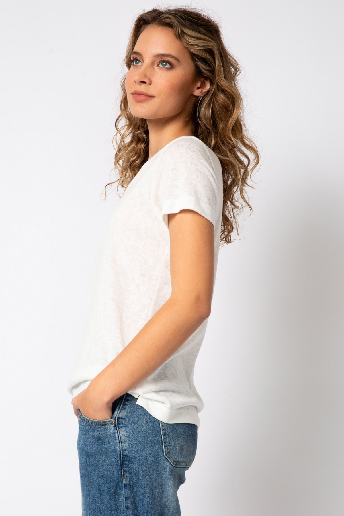 You can never have too many good ivory tees. We love the slub texture of this cotton-modal jersey. Easy fit. Easy to style. Comfy to wear. Model is 5' 8 1/2" wearing size small.