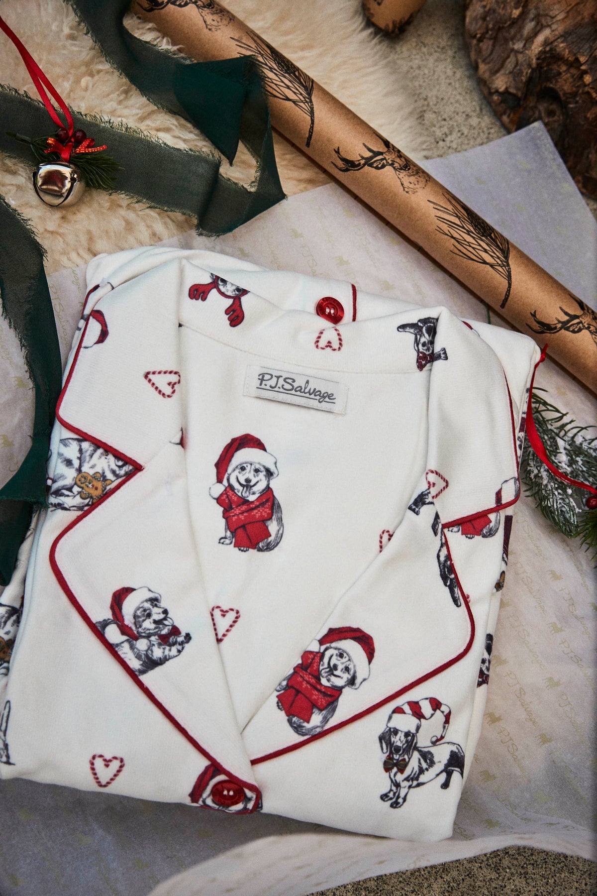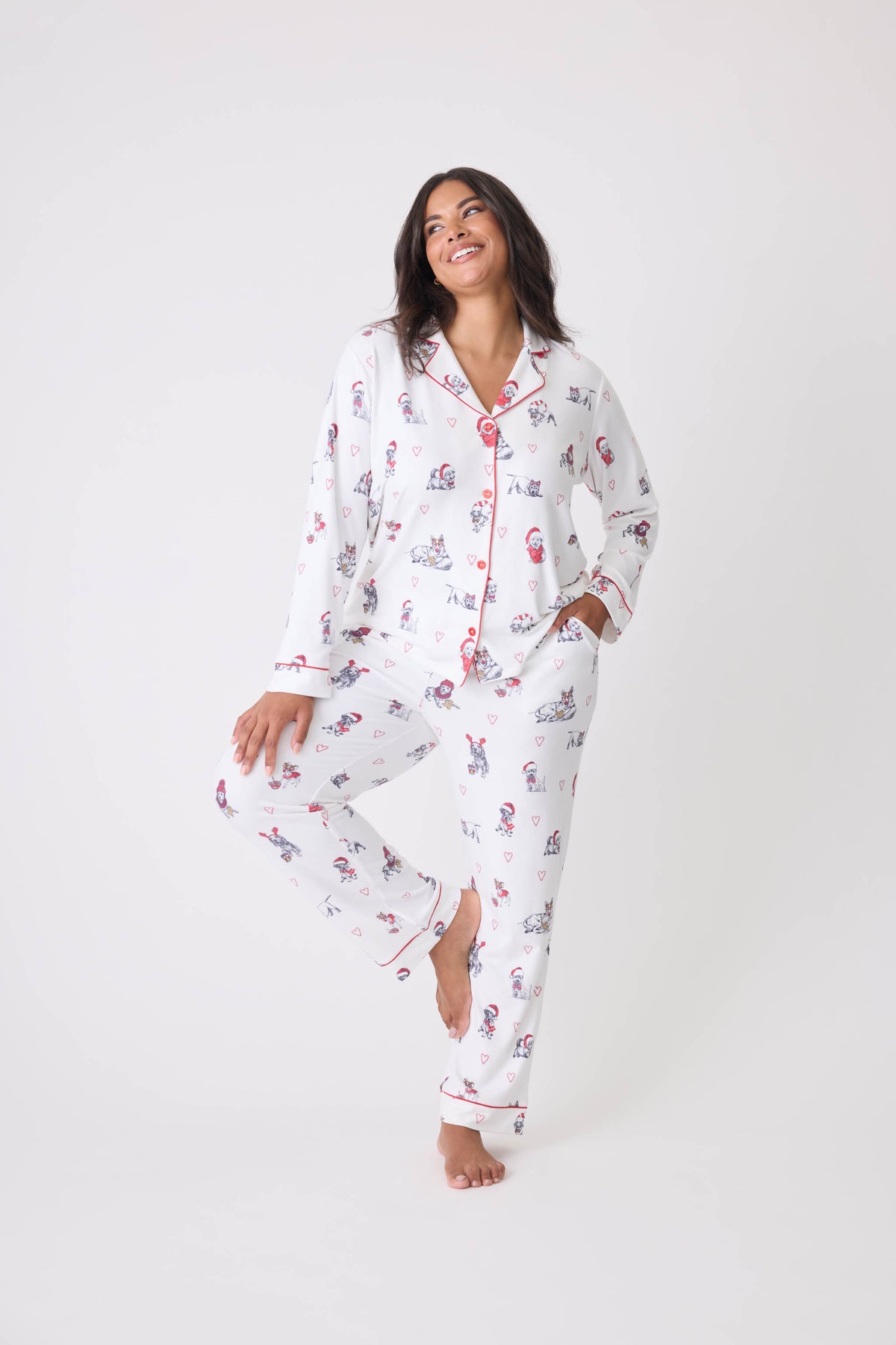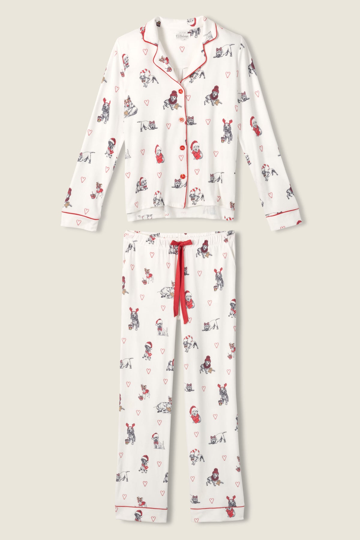Celebrate the season in style with this charming 'Candy Cane Lane' collared PJ set, featuring a delightful pattern of holiday dogs donning festive red hats. The classic collared top exudes a timeless elegance, while the soft fabric ensures comfort during cozy nights. With its cheerful design, this pajama set brings a playful touch to your winter wardrobe, making it ideal for holiday gatherings, gift giving, or simply enjoying a festive movie night. Embrace the joy of the season with this adorable loungewear set!