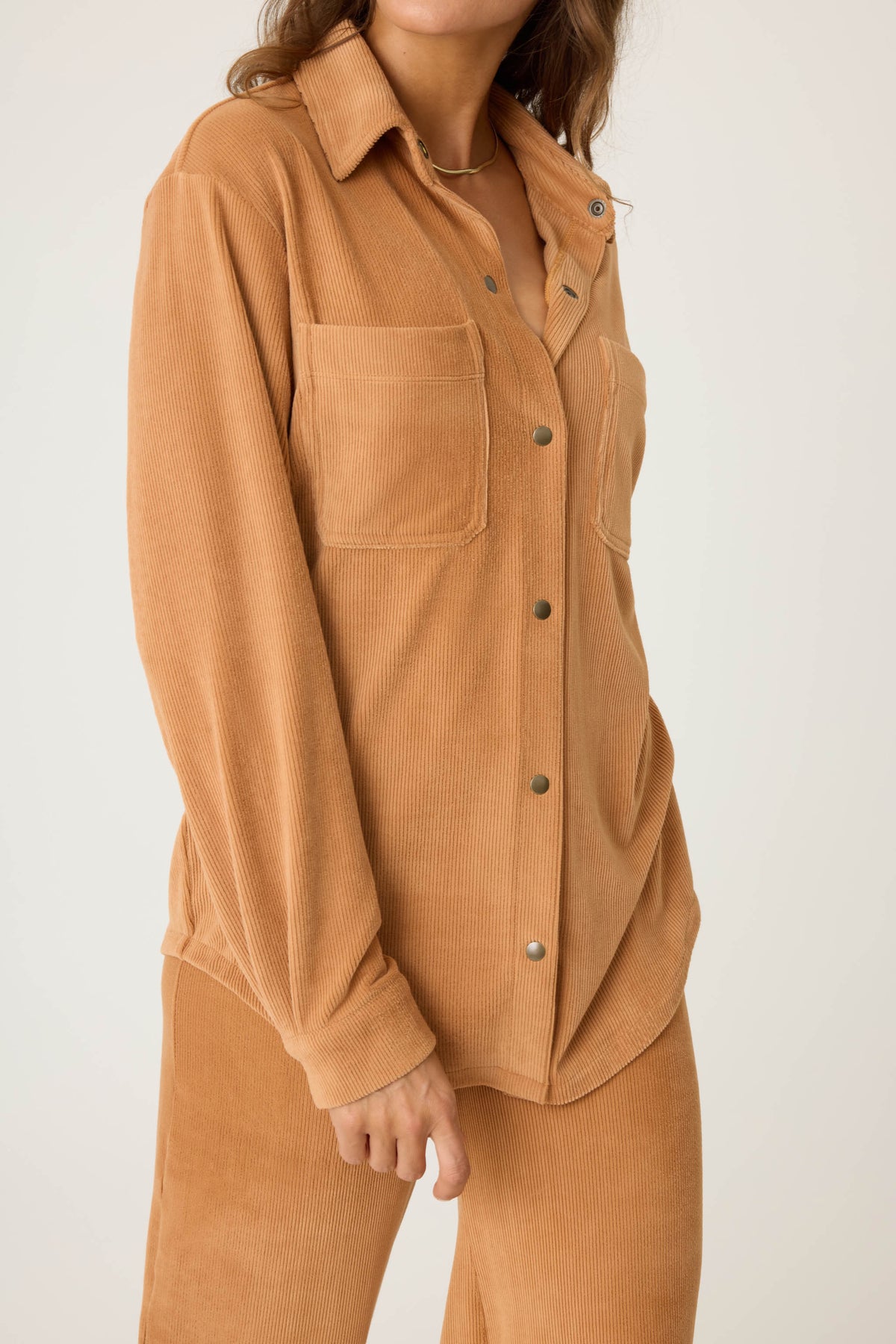 Indulge in luxe comfort with this ultra-soft, fine wale corduroy knit long sleeve. Featuring a chic collared design and button-front closure, this tan top exudes effortless style, perfect for home entertaining or relaxed lounging. Its versatile look and cozy feel make it a go-to for both casual cozy and laid-back luxury.