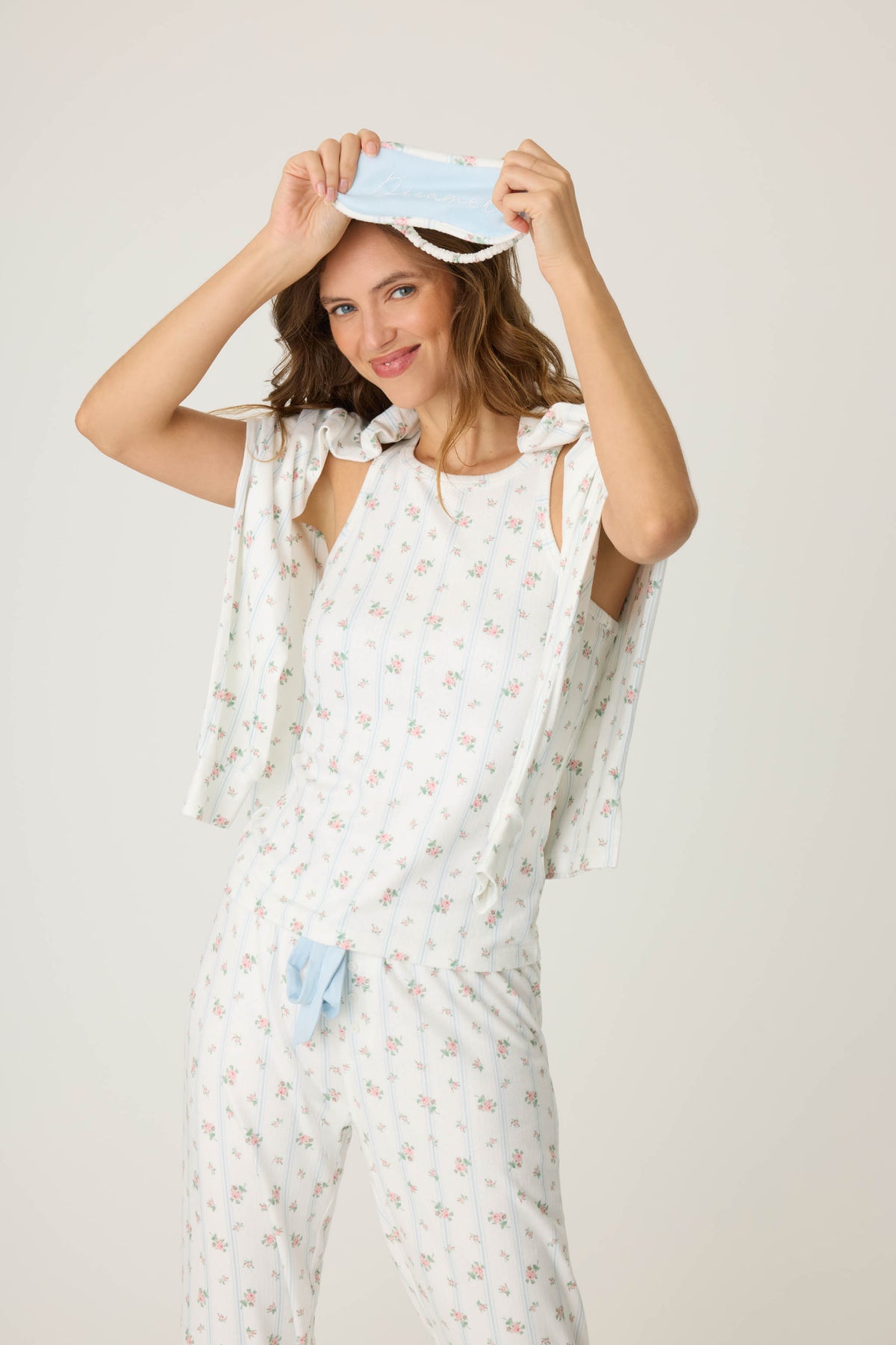 - Includes a fitted tank, long sleeve henley, banded pant, and matching embroidered eye mask
