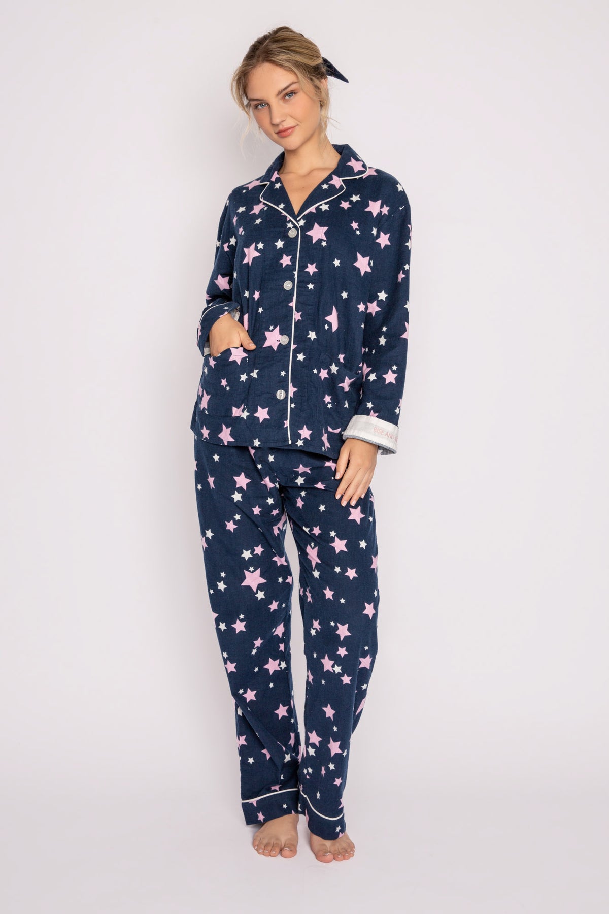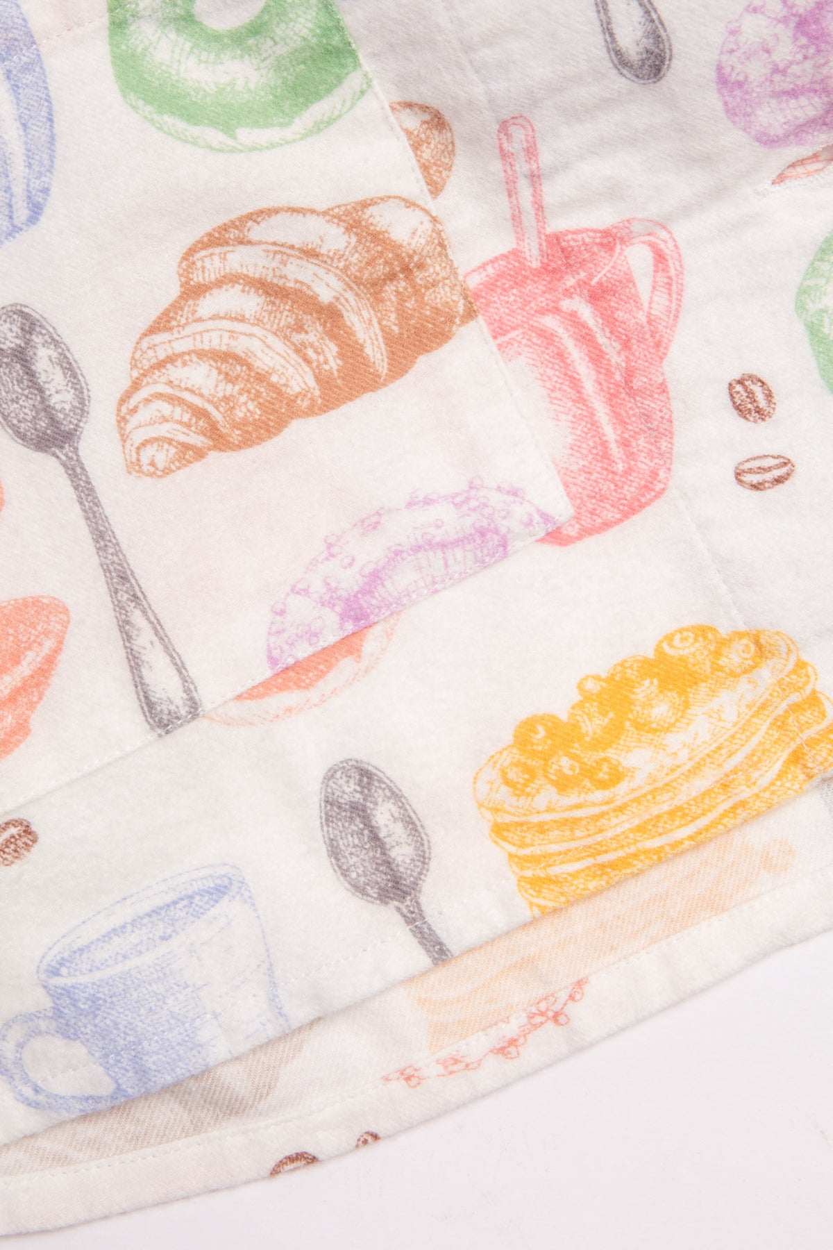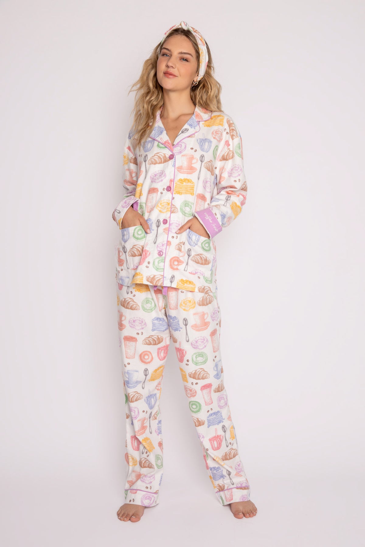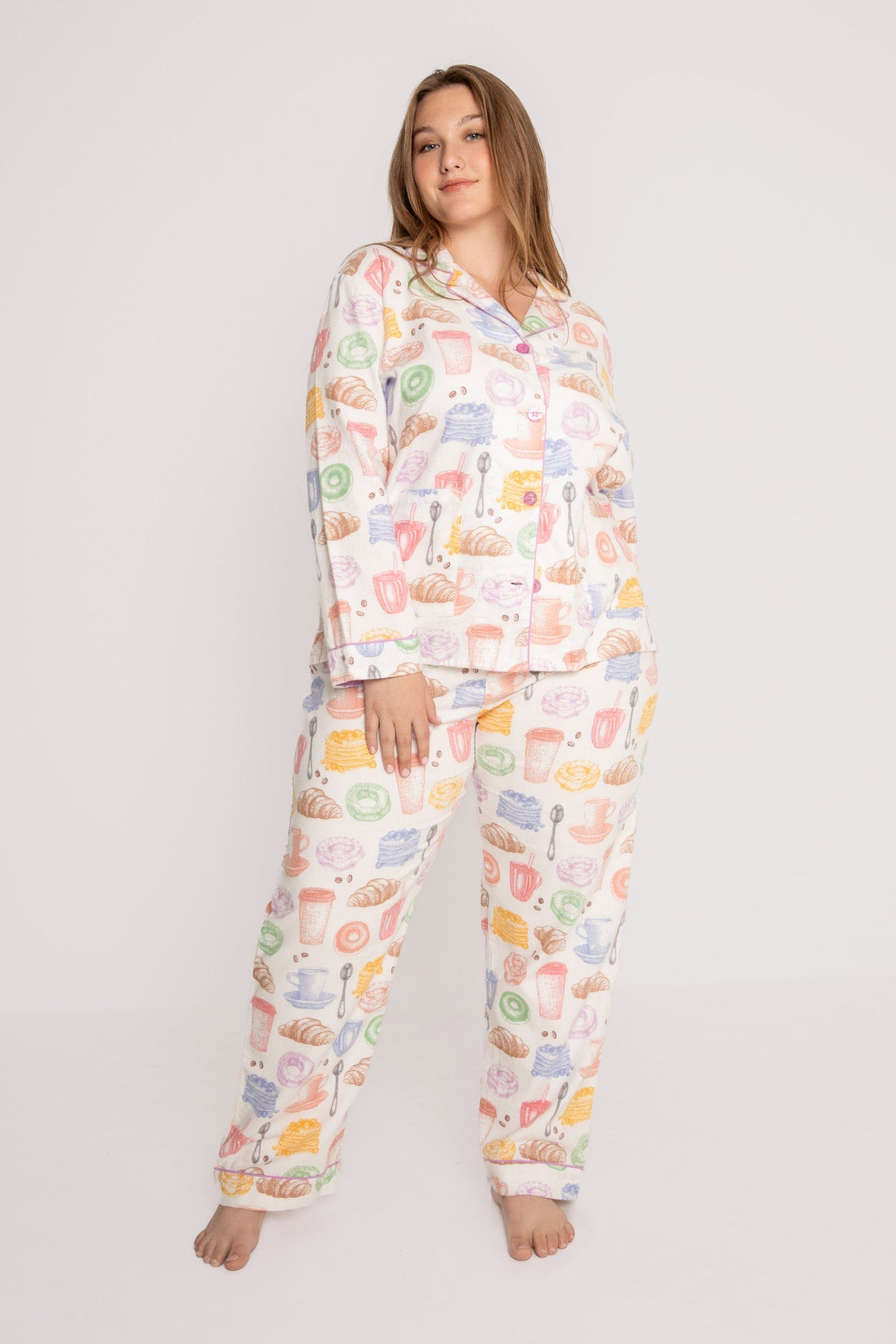 DESCRIPTION: For the love of coffee. Enjoy the morning in a coffee & treat print theme, on our gold-standard soft cotton flannel. PJ has embroidered cuff & matching hair wrap. Model is 5' 9", wearing size small.