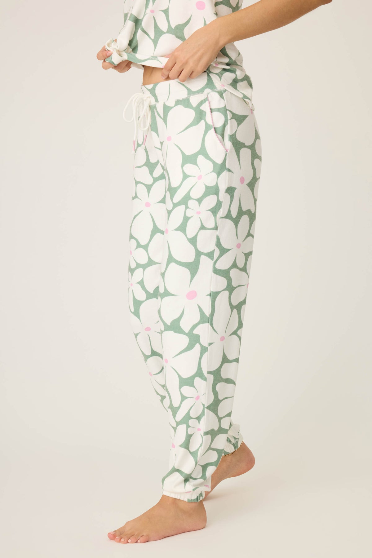 - Women’s green floral lounge pants in soft peachy jersey.