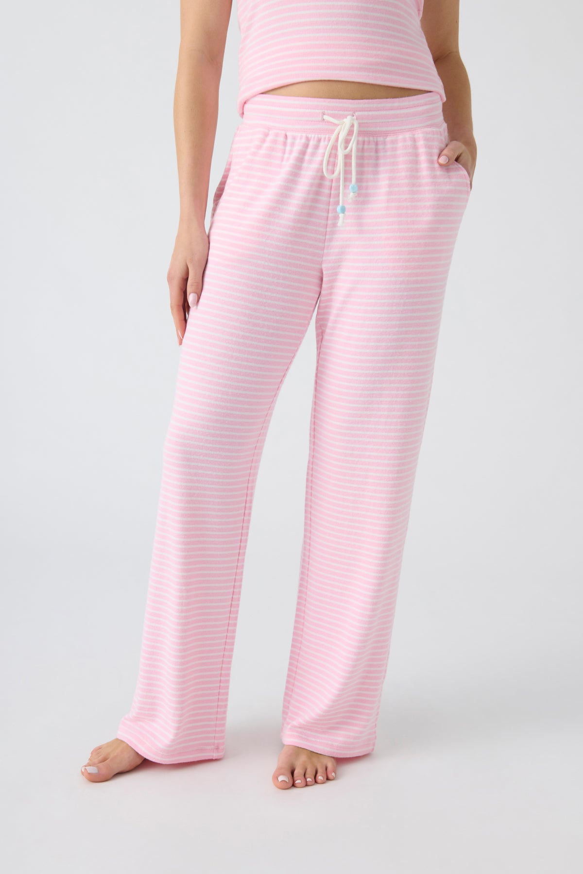 These PJ pants are a reason to smile! It's all in the details as these statement stripe open leg-pants feature blue happy face beads on the pants drawcords.