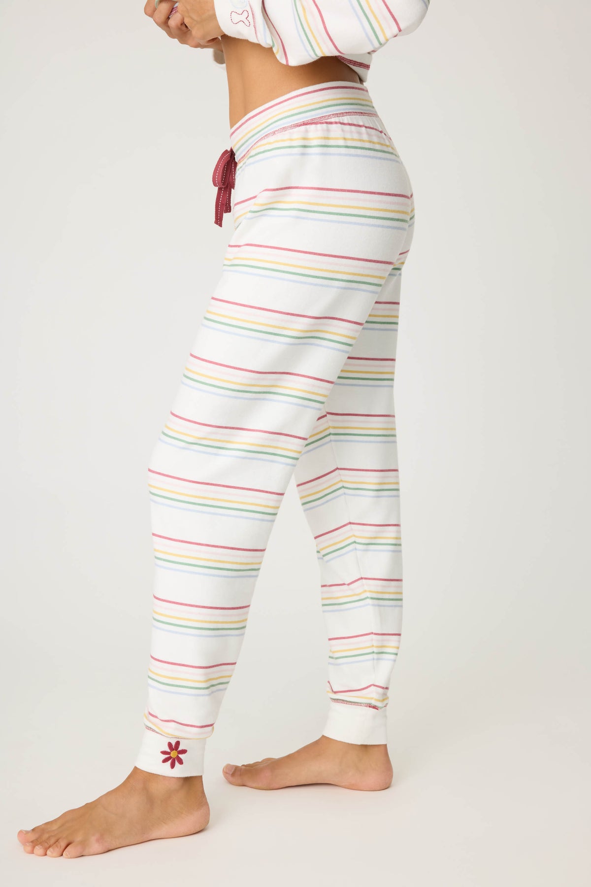 Step into the holiday season with these festive multi-color striped banded pajama pants. Featuring a charming tie waist and delicate flower embroidery on the ankle, these pants are a holiday delight. Perfect for holiday jammies, they offer both style and comfort, ensuring you feel fabulous during your cozy winter evenings.