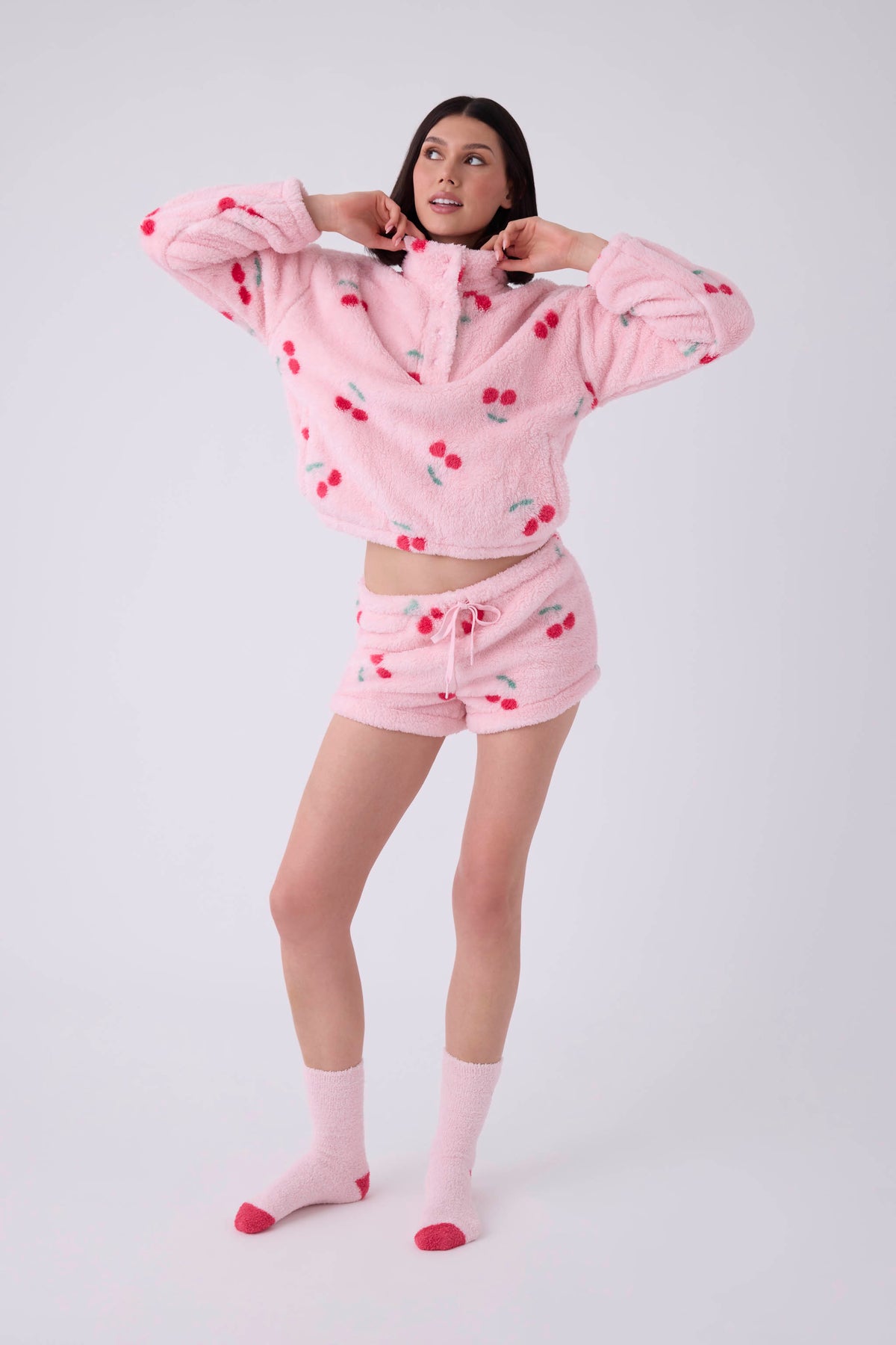 These playful pink fuzzy faux fur PJ shorts are the ultimate blend of comfort and charm! Adorned with a delightful cherry pattern, they're perfect for warm nights or lounging around the house. Slip into these shorts and enjoy the fun, fruity vibe they bring to your loungewear!