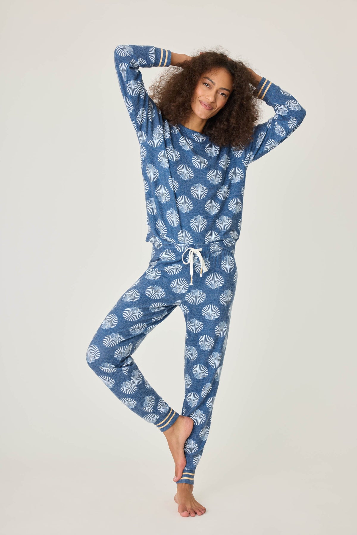 Shell yeah! These jogger pants are crafted from our signature peachy jersey, bringing you cloud-like softness and relaxed vibes. The deep navy backdrop features whimsical shell prints that exude beachy charm, while the gold-striped ankle cuffs add a nautical touch. Whether you're kicking back at home or dreaming of coastal escapes, these are the perfect hybrid of comfort and style. Pair them with the matching hoodie for a coastal-inspired look that’s as breezy as it is playful.