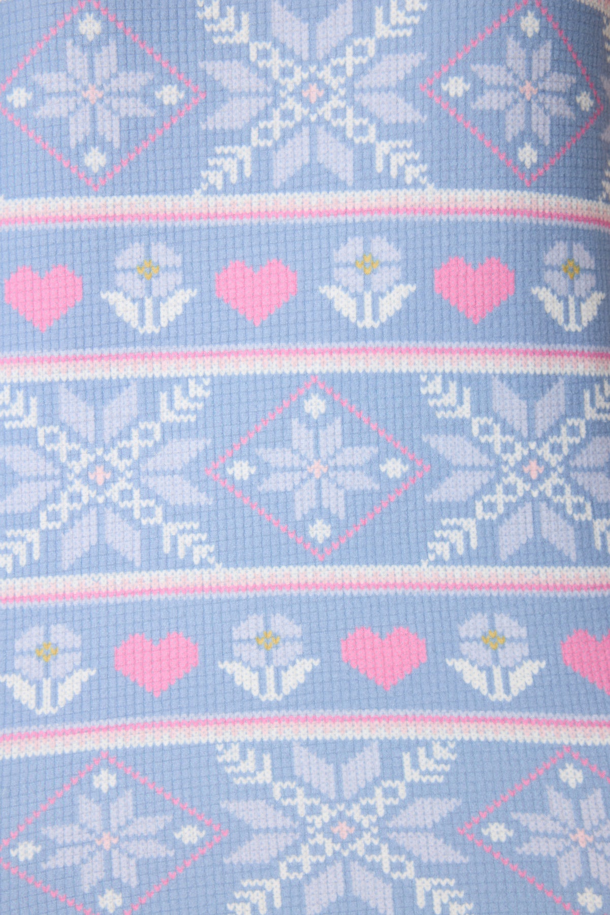 Cozy up this season with our Mountain Bound pajama top, featuring a charming blue fair isle snowflake print on plush velour thermal. This top combines the festive allure of a snow season print with the warmth of velour mini thermal fabric, offering cozy and stylish sleepwear. The rounded hem ensures a flattering fit, making it perfect for both lounging and a restful night’s sleep. Embrace holiday cheer and enjoy the cozy season in fair isle print pajama top.
