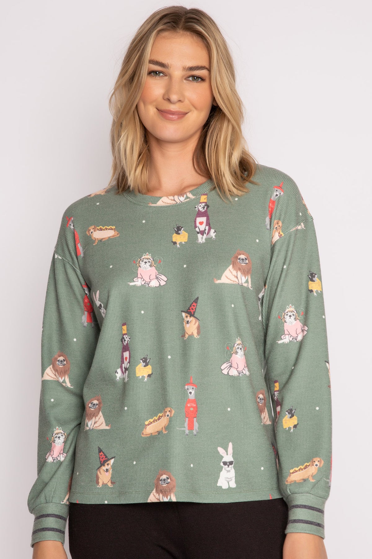 DESCRIPTION: Surround yourself with puppy love in a favorite brushed waffle pj top. You'll love the spirit of these dogs-in-costumes print to cheer up any chilly day. Model is 5' 9", wearing size small.
