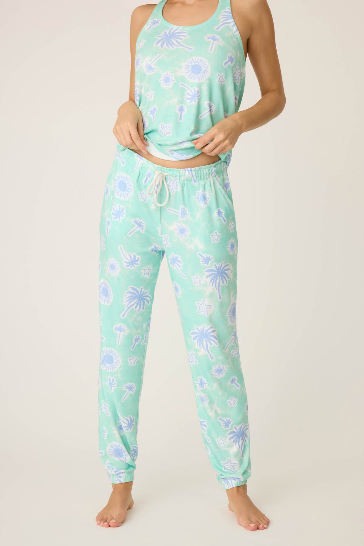 These tropical-print lounge pants are your ticket to paradise. Made from soft brushed knit in a soft mint green, they’re printed with blue palm trees, starfish, and florals for a tranquil island vibe. The relaxed fit and banded cuffs make them perfect for unwinding after a beach day or just daydreaming of one from the couch.