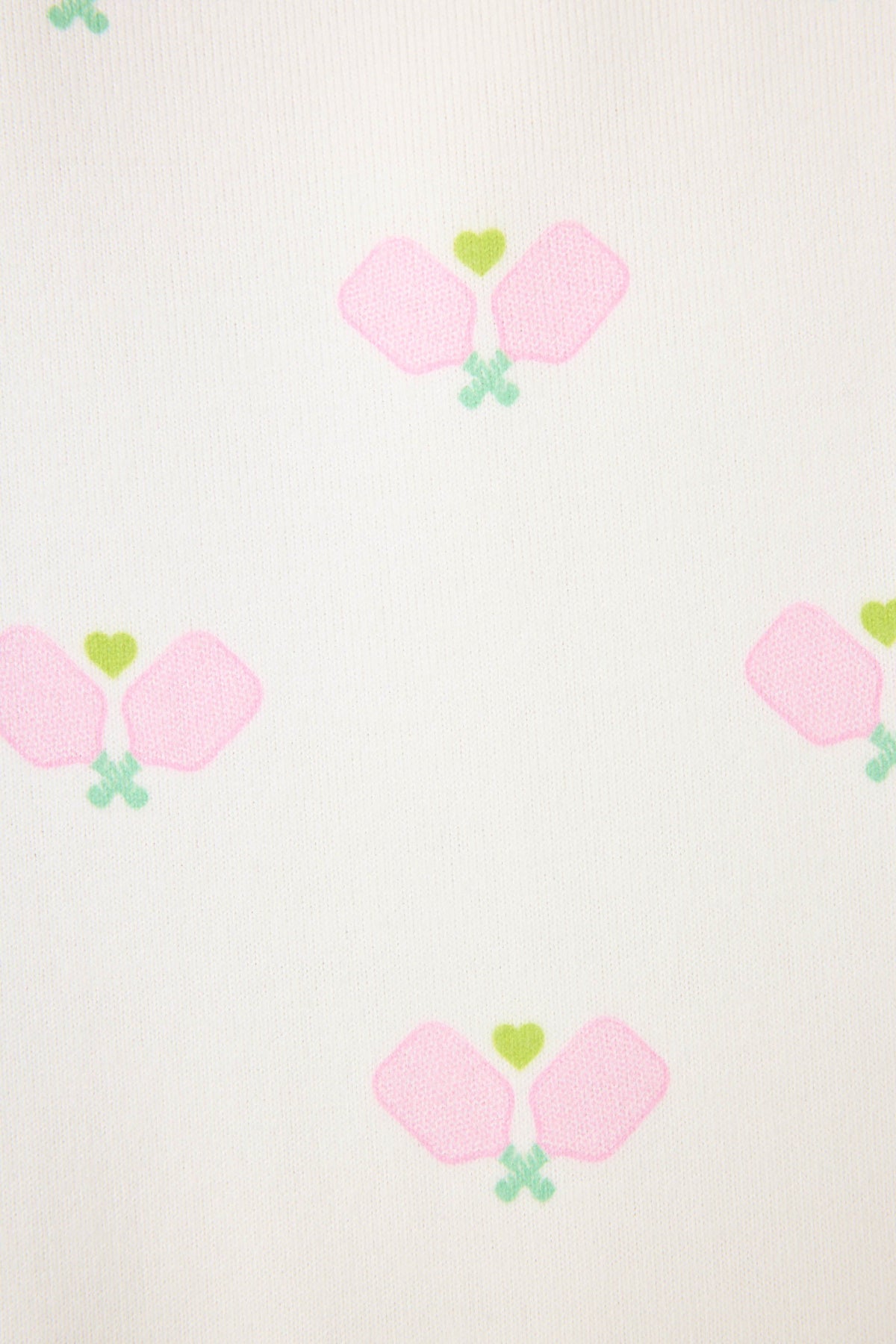 Make a sporty statement with these ivory-pink pickleball racket-printed shorts. The green and pink contrast binding and striped waistband add a fun twist