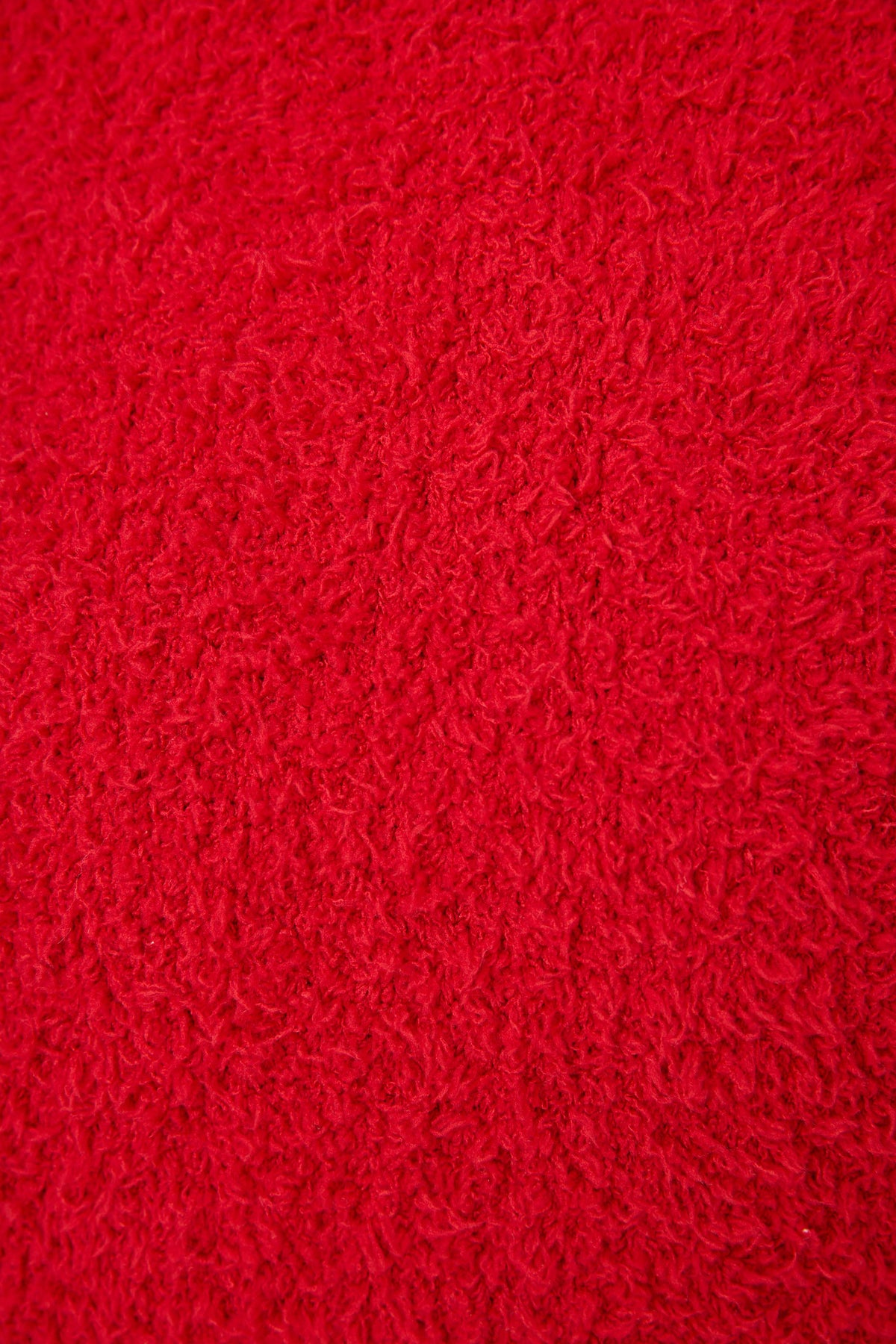 Women’s red bouclé robe with long sleeves, front pockets, and self-tie waist.