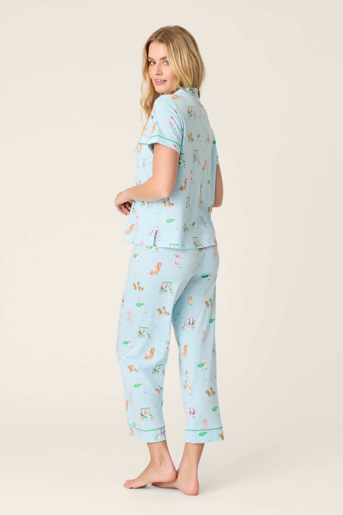 Playful and lighthearted, this pajama set features dogs hitting the green across a soft light blue backdrop. The short-sleeve button-down top is finished with contrast piping and a chest pocket, while the matching pants feature an elastic waistband and adjustable drawstring for easy comfort from bedtime to morning coffee.