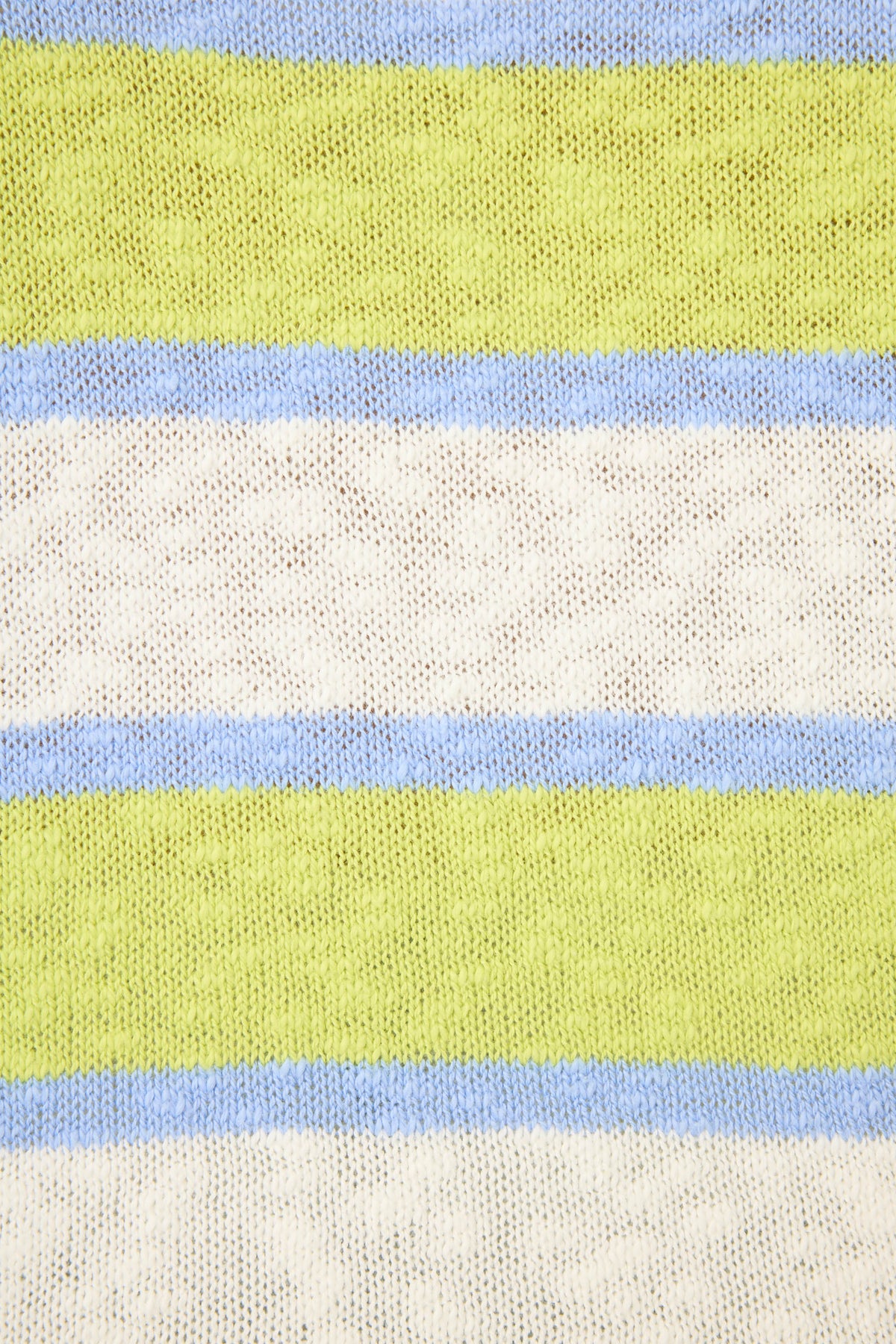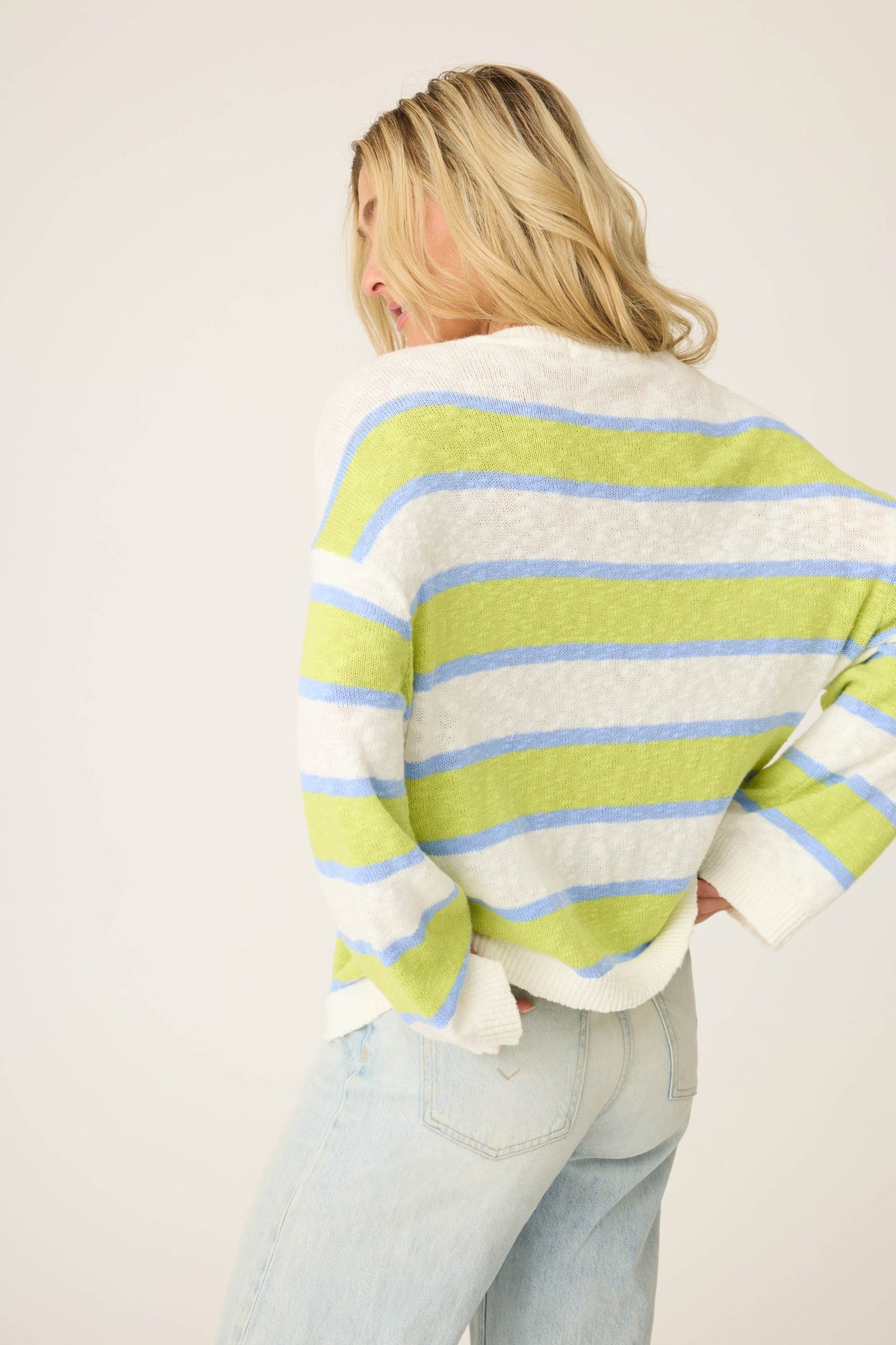 Easy, breezy, and made for laid-back days. This striped sweater is knit from soft, slub-textured cotton with a relaxed fit and bold bands of lime green, sky blue, and ivory. Ribbed trim at the cuffs, collar, and hem adds a clean finish. Throw it on with your favorite jeans or keep it cozy at home—it’s a lounge-ready layer with major charm.