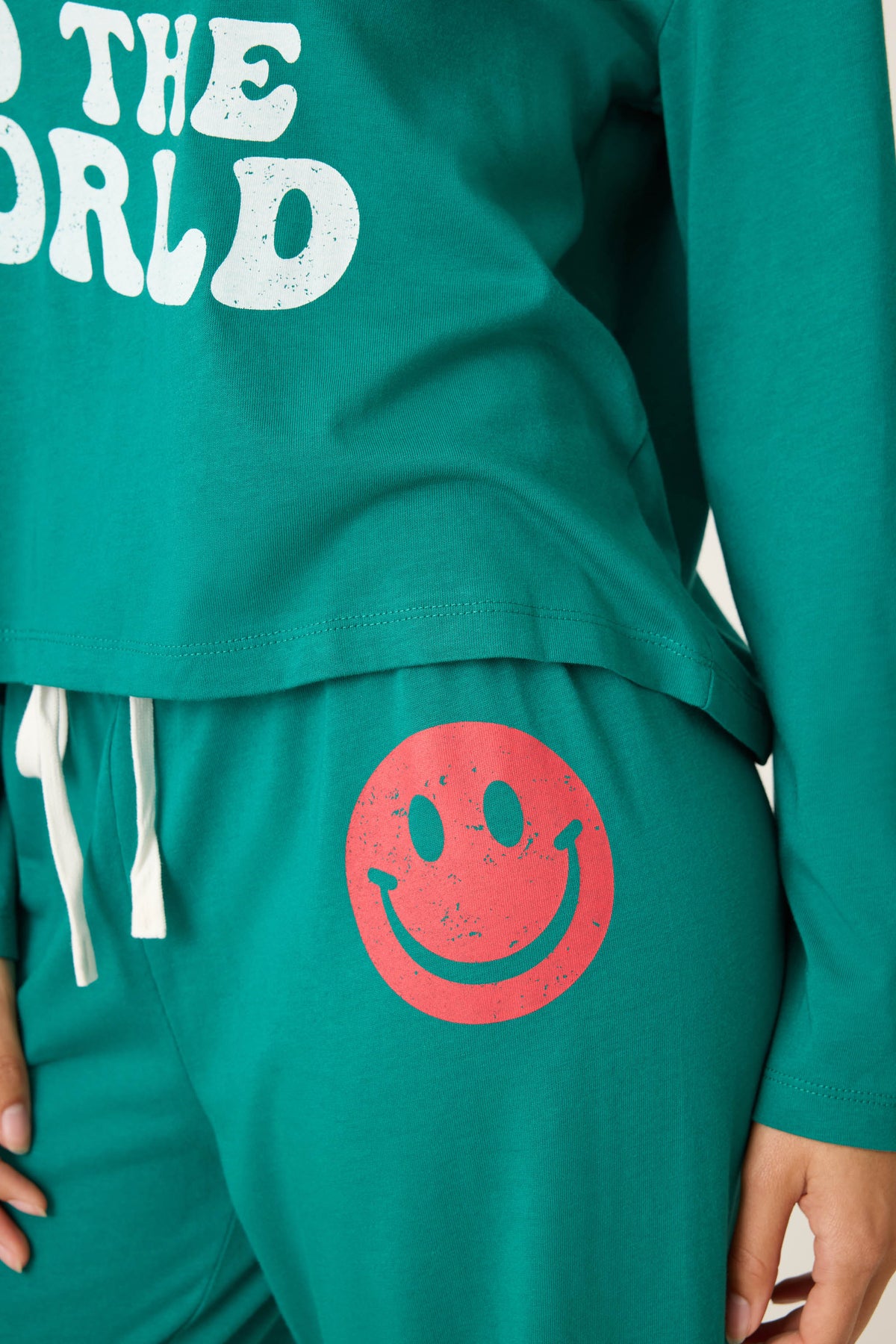 Celebrate cozy season in this emerald pajama set, made from soft jersey with a cropped long sleeve top and relaxed drawstring pants. A bold “Joy to the World” graphic with a cheerful smiley face brings a playful holiday twist to your lounging lineup.