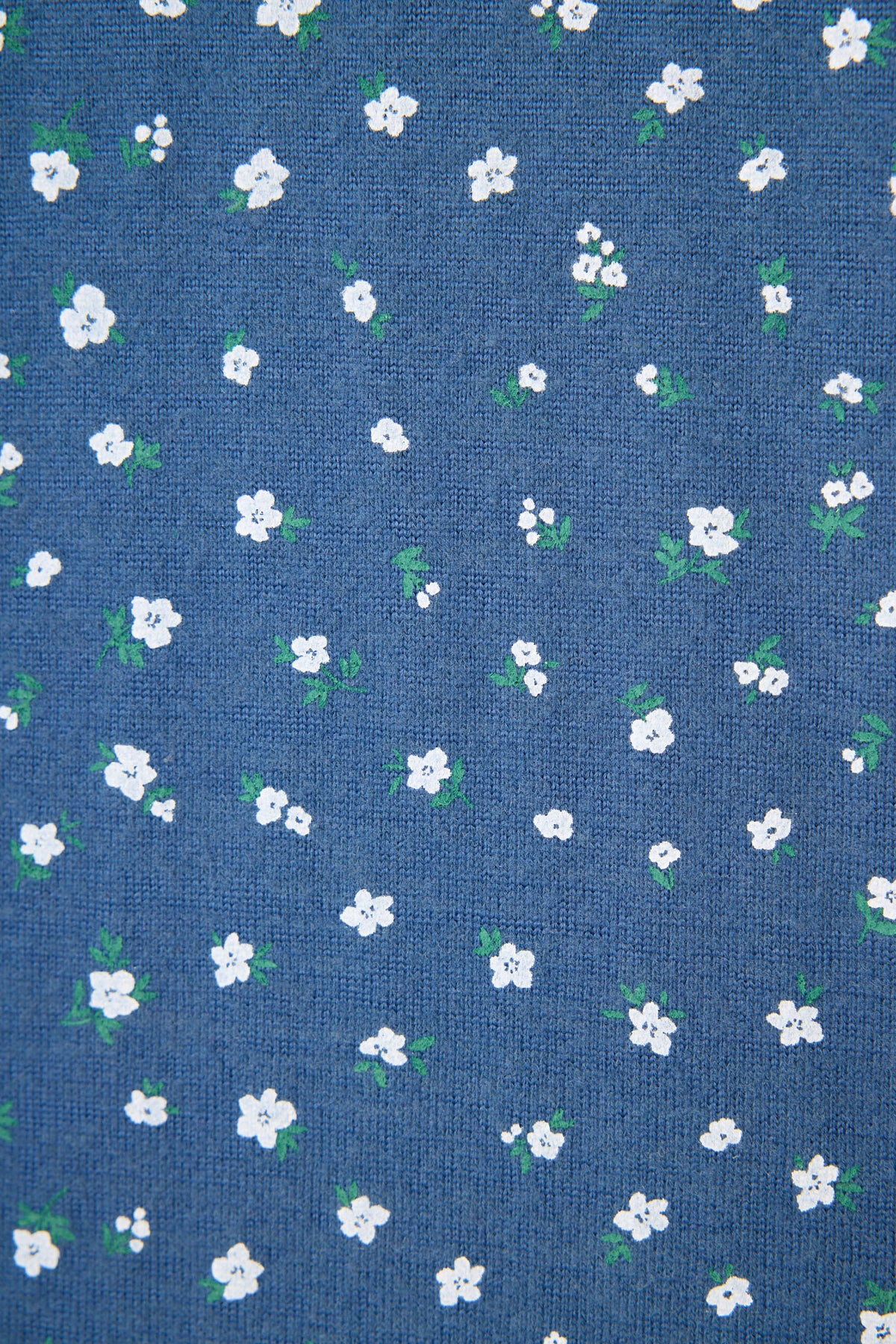 Dreamy and oh-so darling, these pajama pants are crafted from soft peachy jersey with a ditsy floral print on a blue backdrop, finished with striped cuffs and a drawstring waist. Their easy fit keeps things comfy and sweet—just right for lounging or pairing with the coordinated long-sleeve.