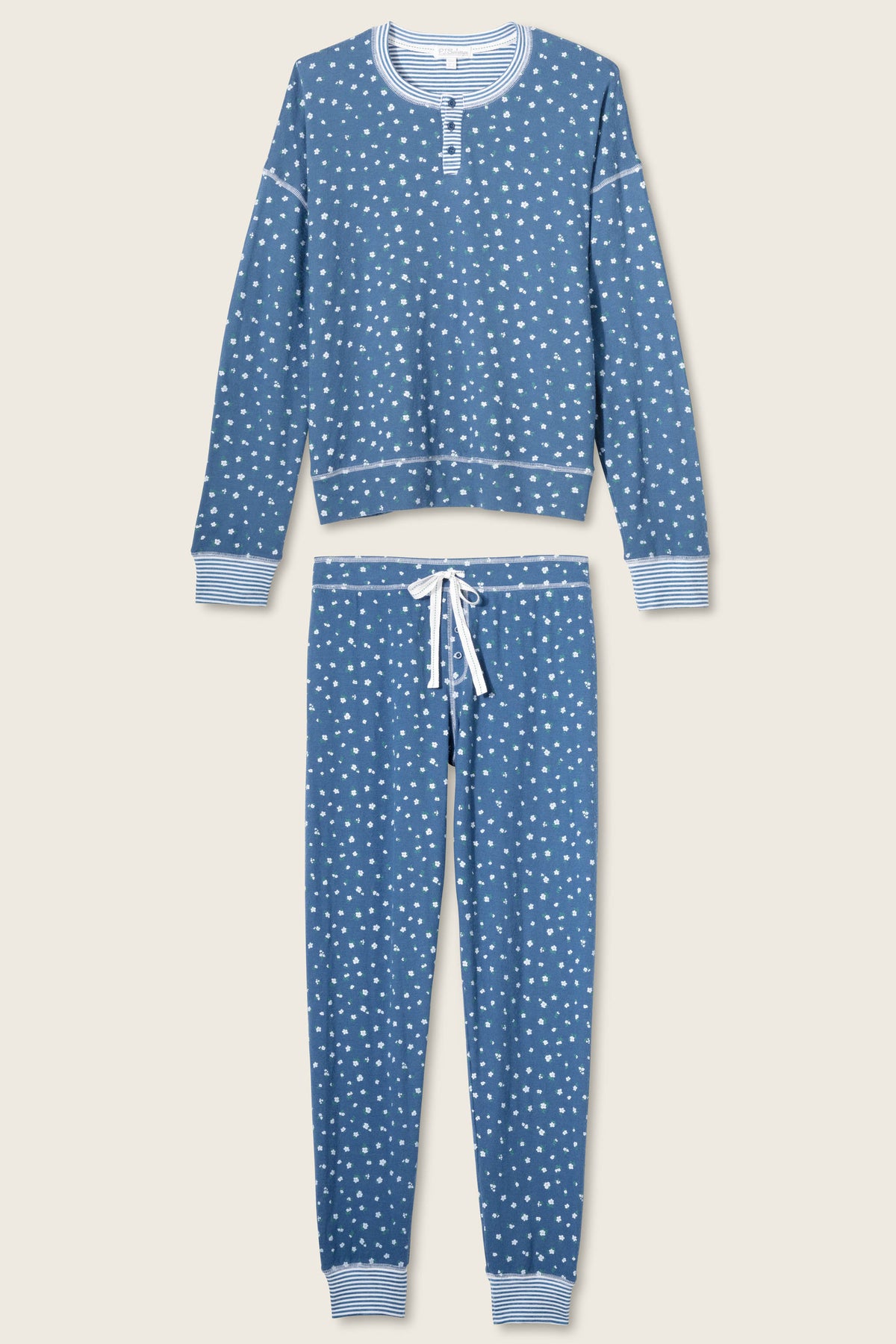 • Women’s blue pajama set in peachy jersey with ditsy floral print, striped trim, long-sleeve henley top, and drawstring pants.