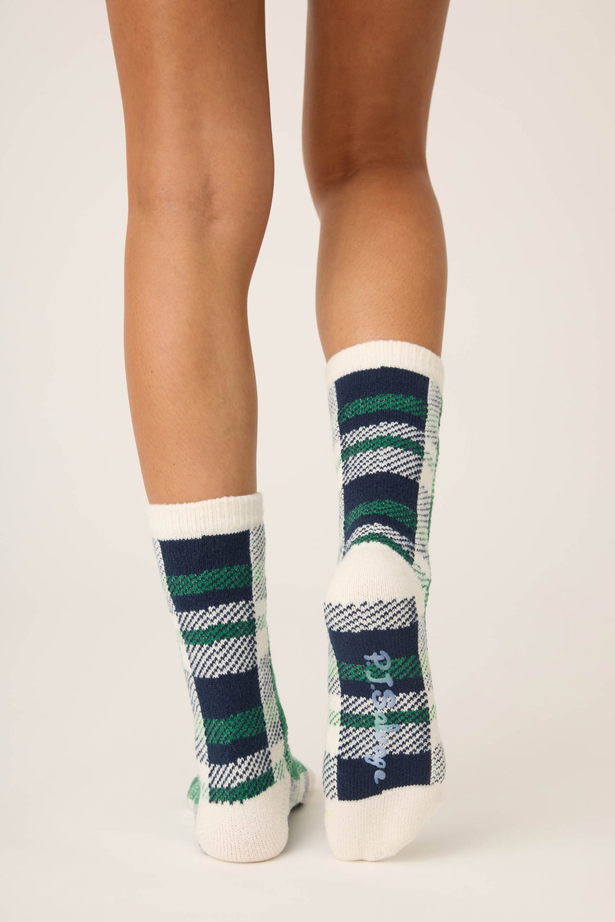 - Women’s plaid socks in fuzzy knit with blue and green check pattern and gripper bottoms.