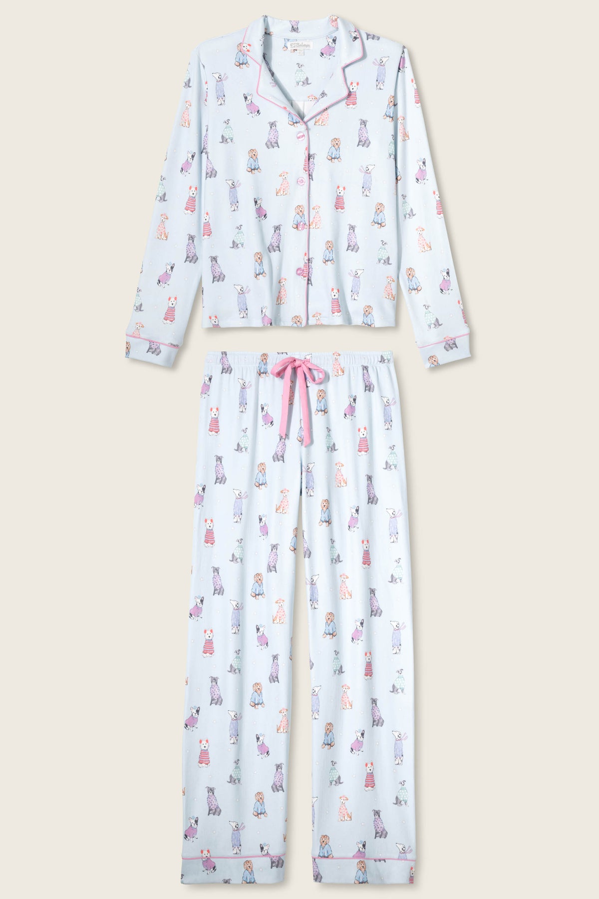 - Women’s light blue pajama set in dog print with button-front top and drawstring pants.