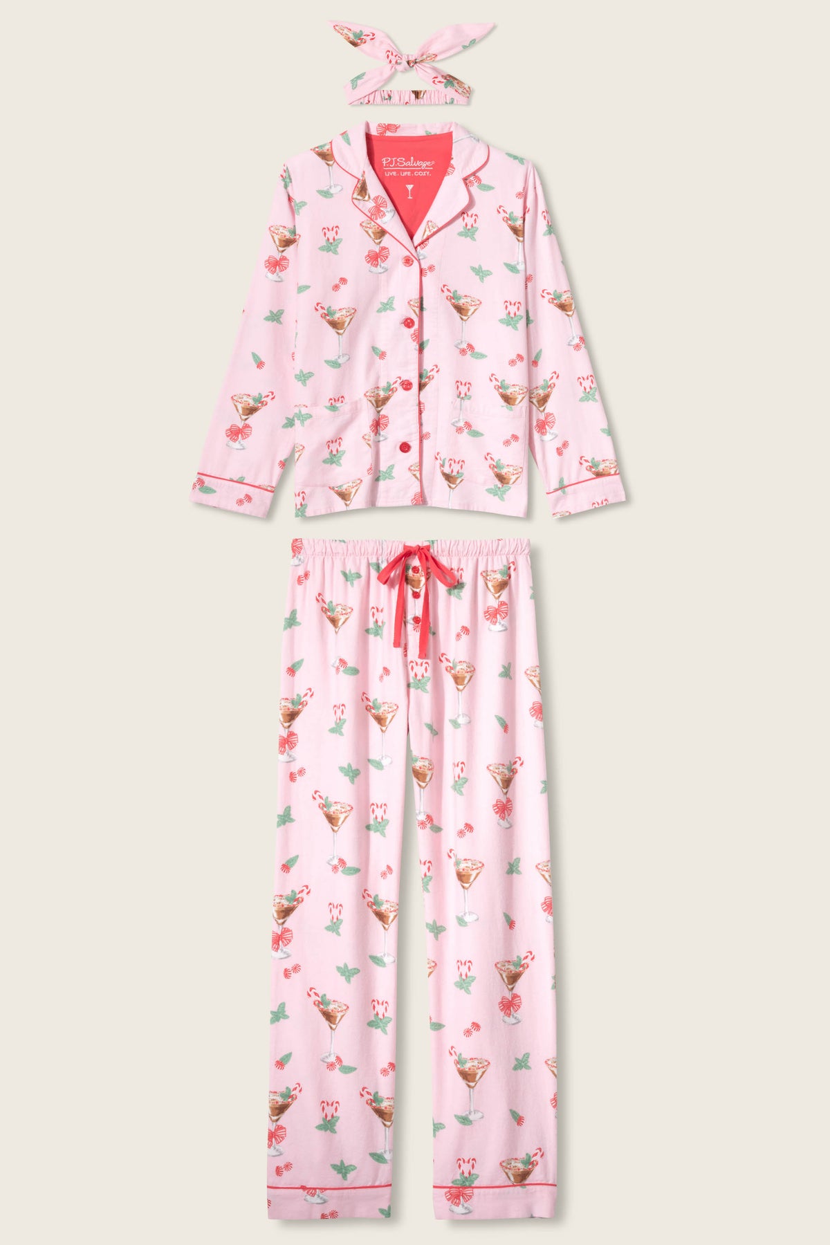 Festive and spirited, this three-piece flannel set is made from soft cotton in a classic twill weave, complete with a button-front top, relaxed drawstring pants, and a matching headband. The blush-pink backdrop is covered in candy cane martinis, mint sprigs, and cheery little bows, finished with contrast piping and a cuff that cheekily reads “Tini Time”—made for holiday happy hours, sweet nightcaps, and drifting off afterwards.