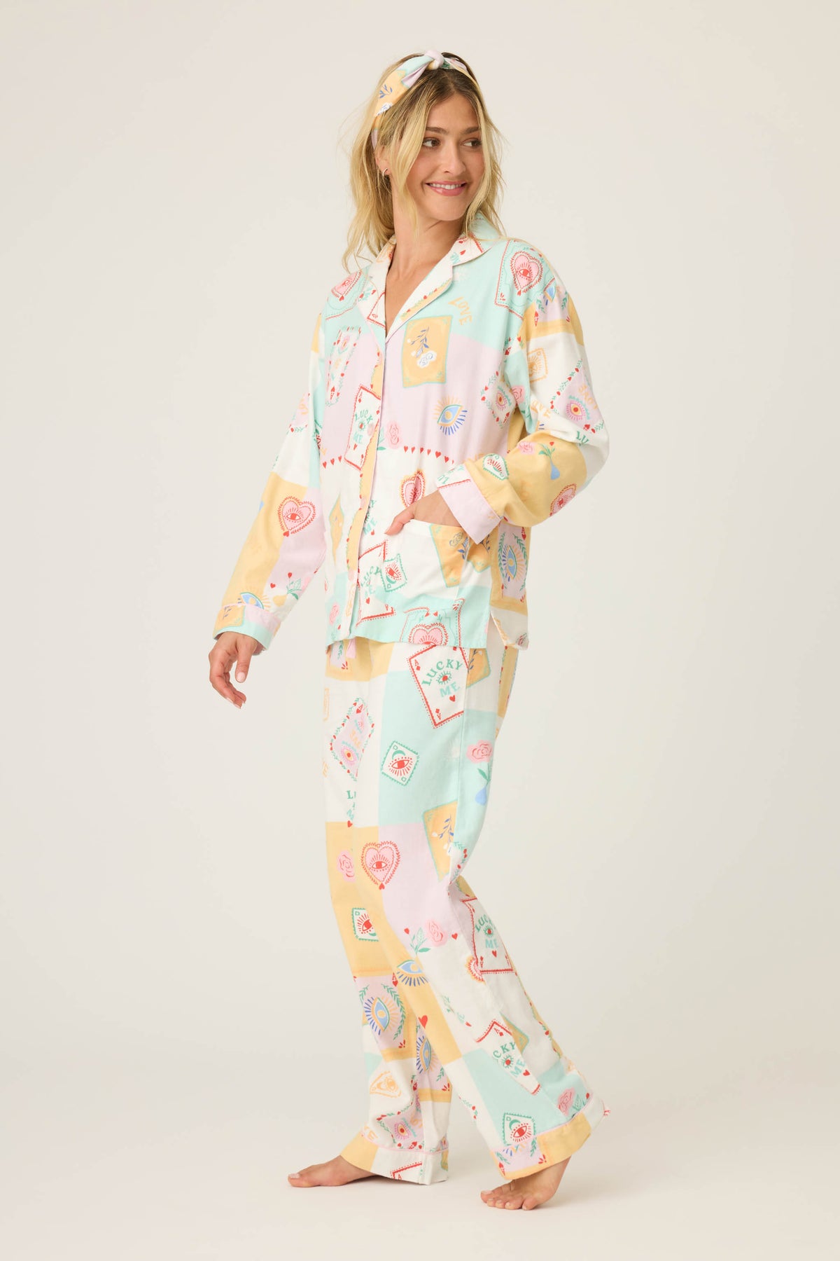 Sleep, lounge, repeat in this dreamy three-piece flannel set with a whimsical, luck-inspired twist. Made from soft cotton in a classic twill weave, it includes a button-up shirt, relaxed-fit pants, and a matching headband. The patchwork-style design blends soft ivory, pastel mint, peach, and lilac, scattered with playful motifs—lucky playing cards, eye talismans, radiant hearts, blooming flowers, and “Lucky Me” script—for a look that’s as charming as it is cozy.