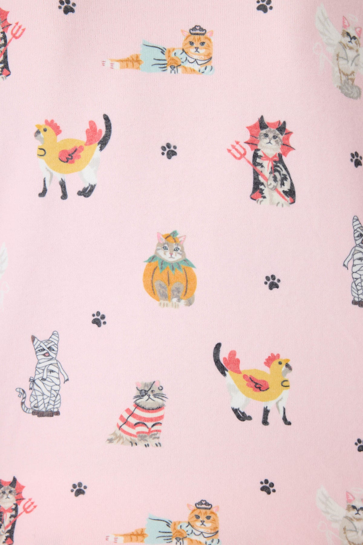 Playful and purr-fect for spooky season, this peachy jersey long-sleeve brings seasonal spirit to your downtime. The soft ballet pink hue is covered in whimsical Halloween cats dressed as pumpkins, mummies, pirates, and more, with striped cuffs at the wrists—perfect for layering over PJ pants or wearing solo for cozy nights in.