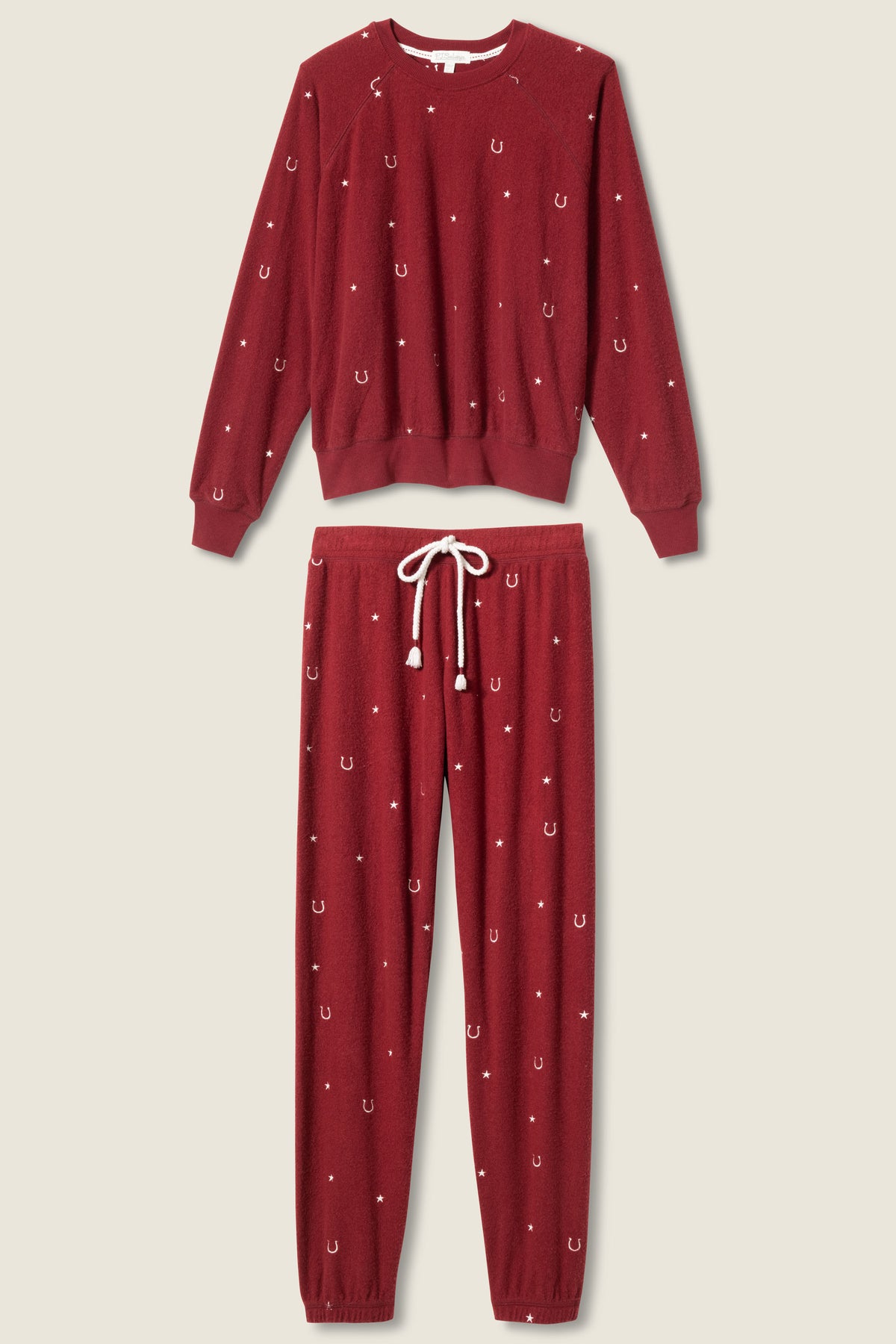• Women’s burgundy fleece lounge set with white horseshoe and star print.