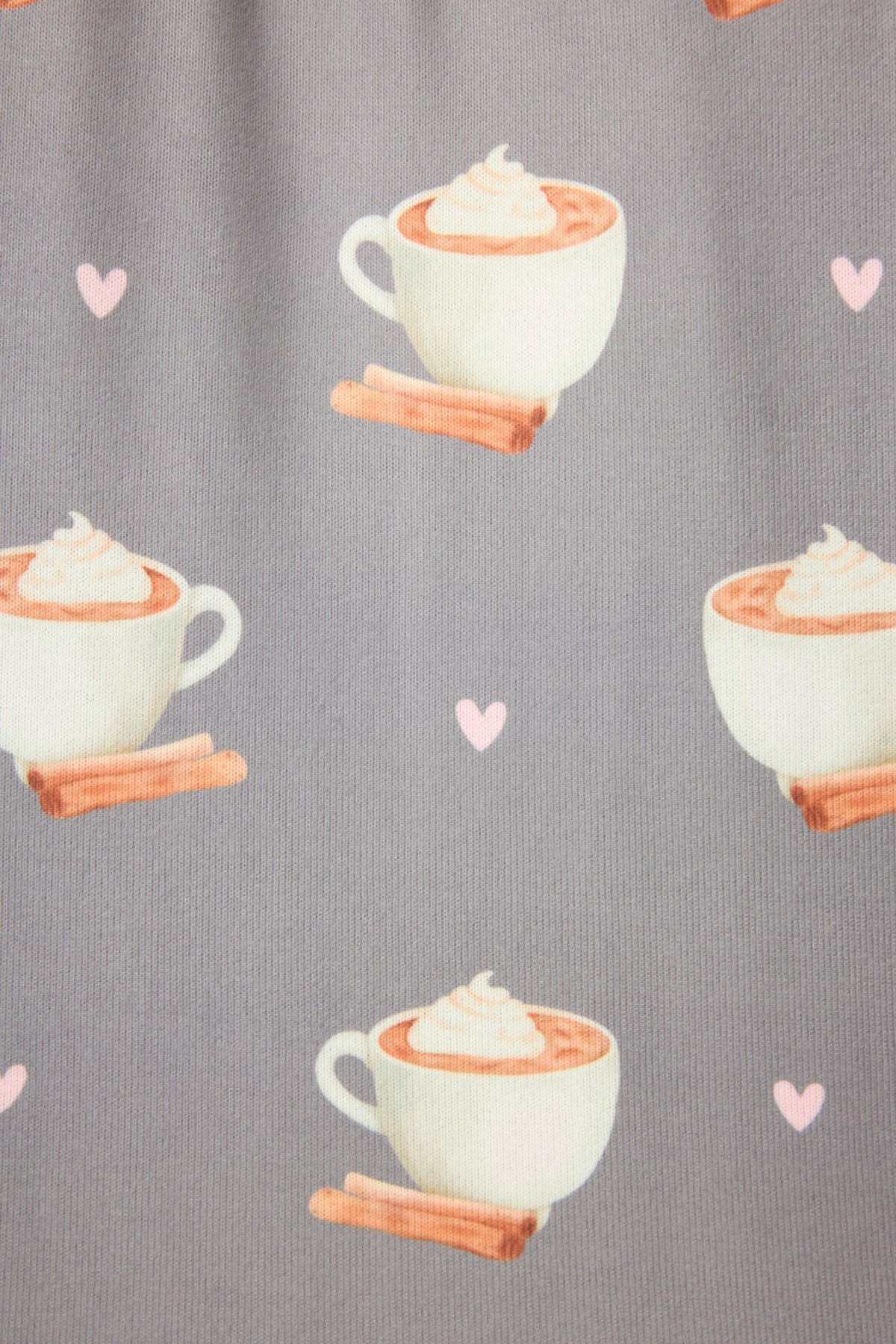 - Women’s long sleeve top in grey with allover latte cup, cinnamon stick, and heart print. Made from heavy butter jersey with a soft feel and stretch. Features a pink striped collar, faux button placket, and striped sleeve cuffs.