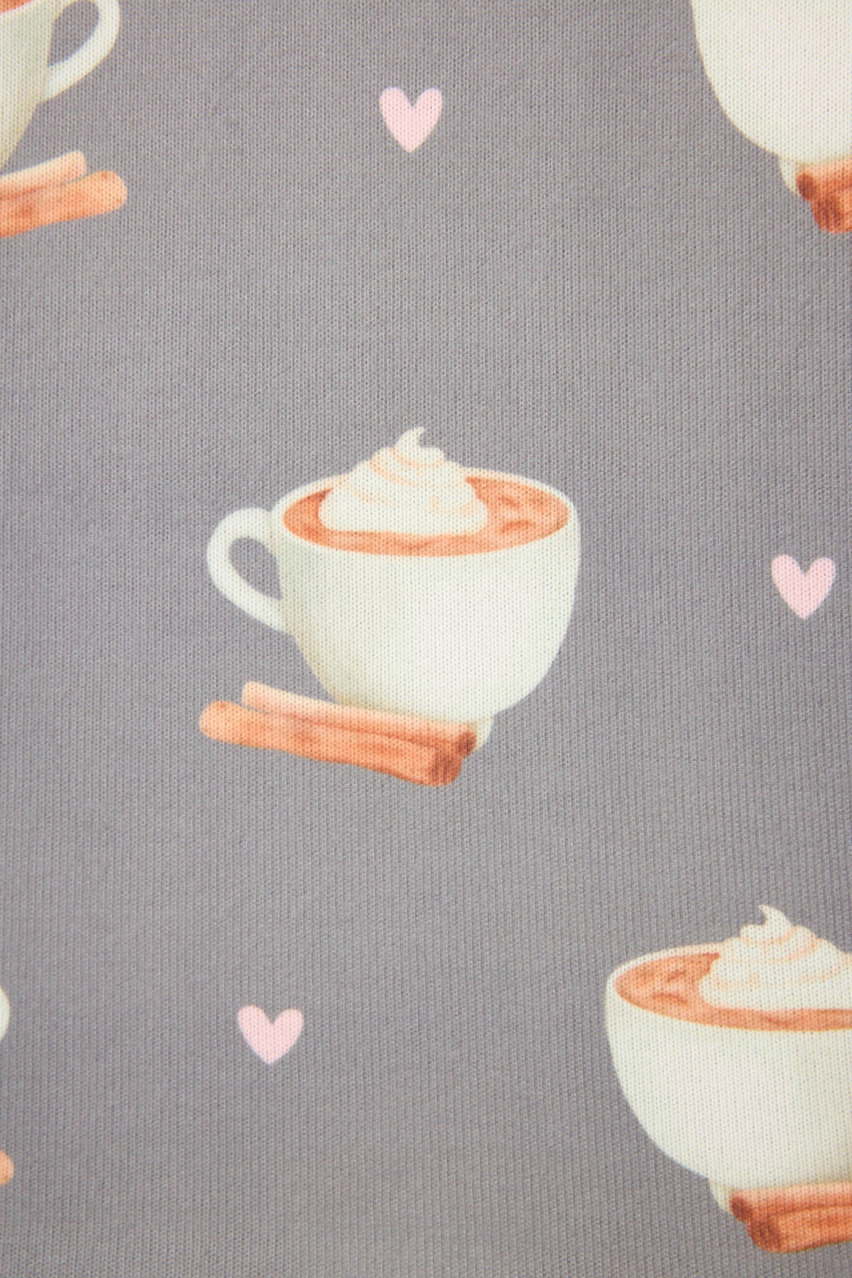 • Women’s shorts in grey with allover latte cup, cinnamon stick, and heart print. Made from heavy butter jersey with a soft feel and stretch. Features a pink striped waistband, faux fly, and drawstring tie.