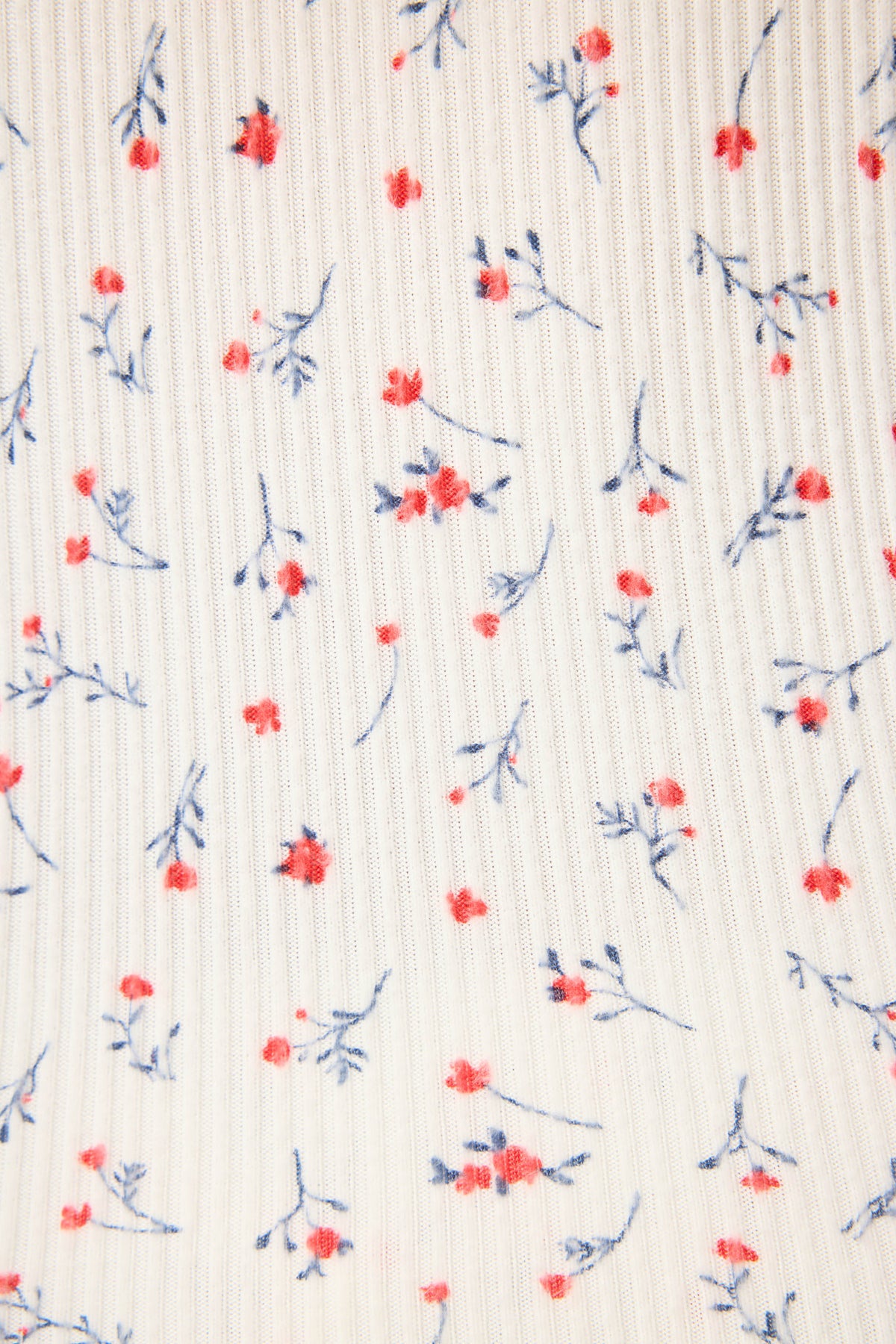 Women’s ivory wide-leg pant with rose print and drawstring waistband with lettuce-edge trim. Made from 96% polyester and 4% elastane brushed 3x3 rib.
