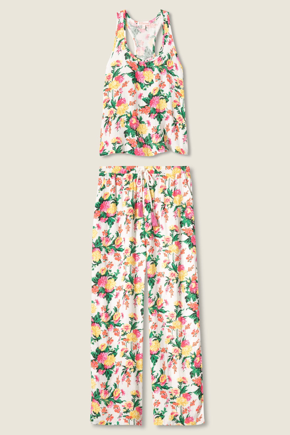 - Women’s floral pant set in crinkled gauze.