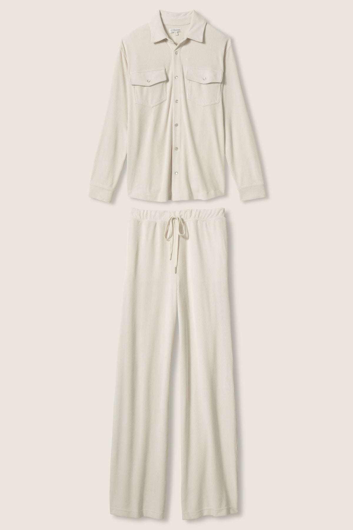 - Women’s velour corduroy PJ set in soft ivory. Long-sleeve button-up top with chest pockets and wide-leg pants with drawstring waist.