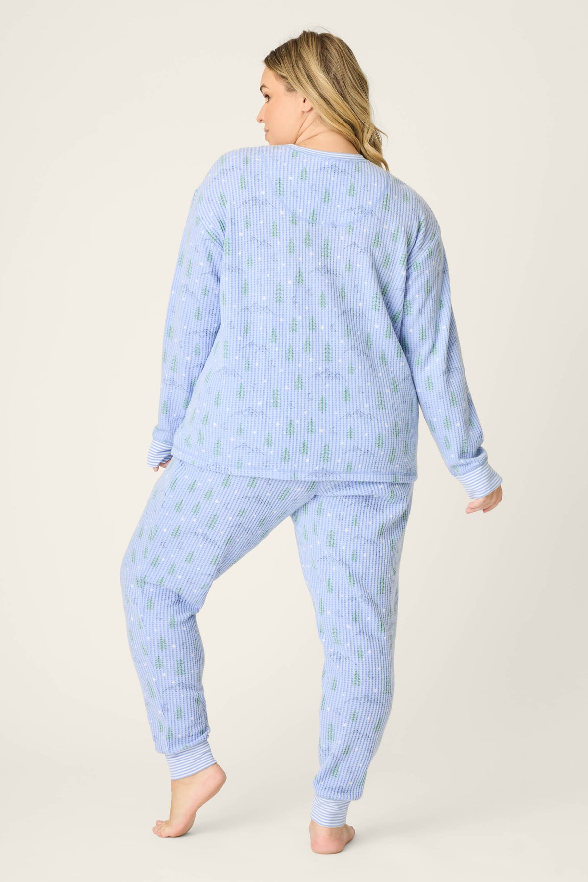- Women’s periwinkle pajama set with tree print, henley long sleeve top, and jogger pants in brushed thermal fabric.