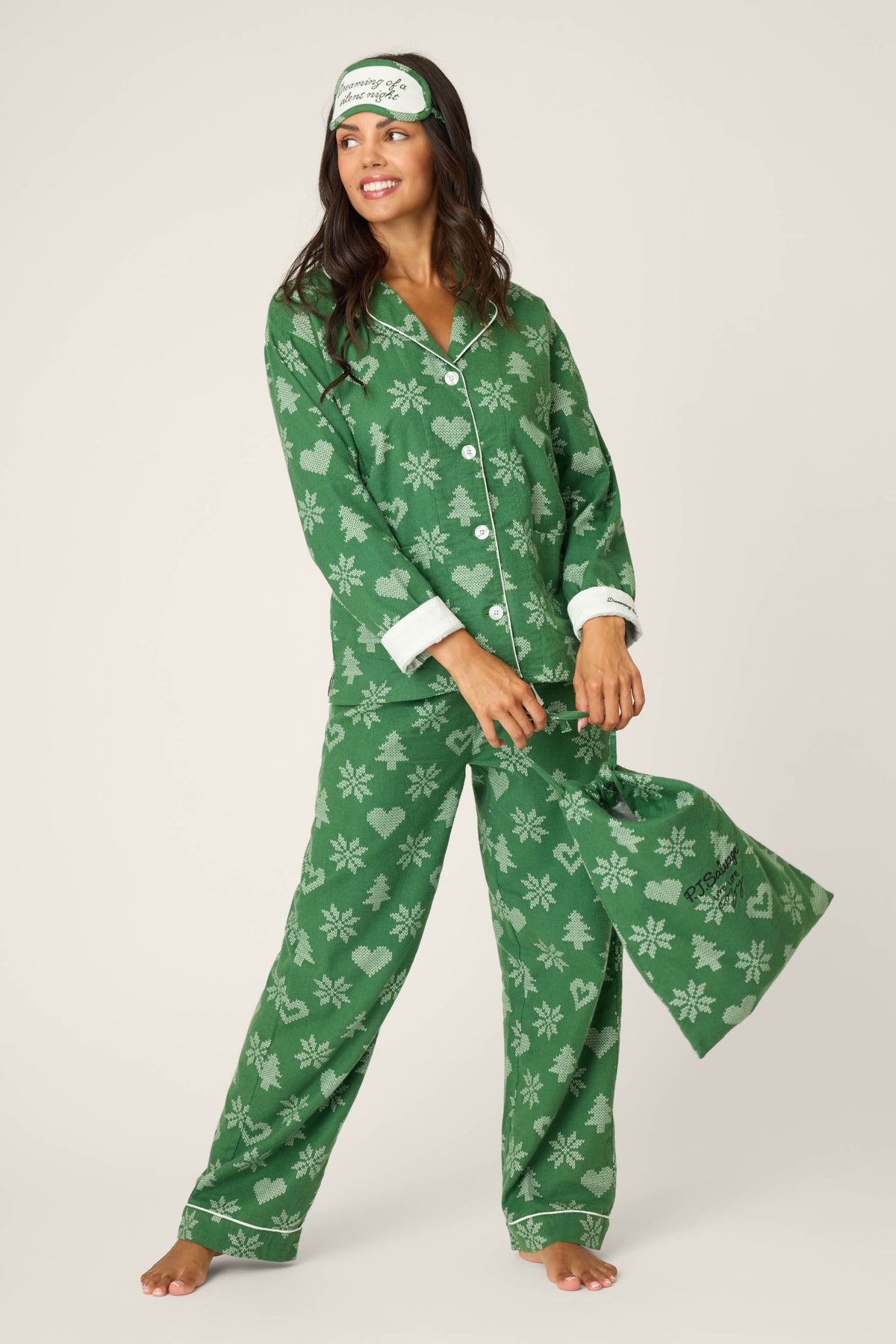 Women’s green cotton flannel holiday pajama set with allover tree print, button-up top, straight-leg drawstring pants, and matching eye mask.
