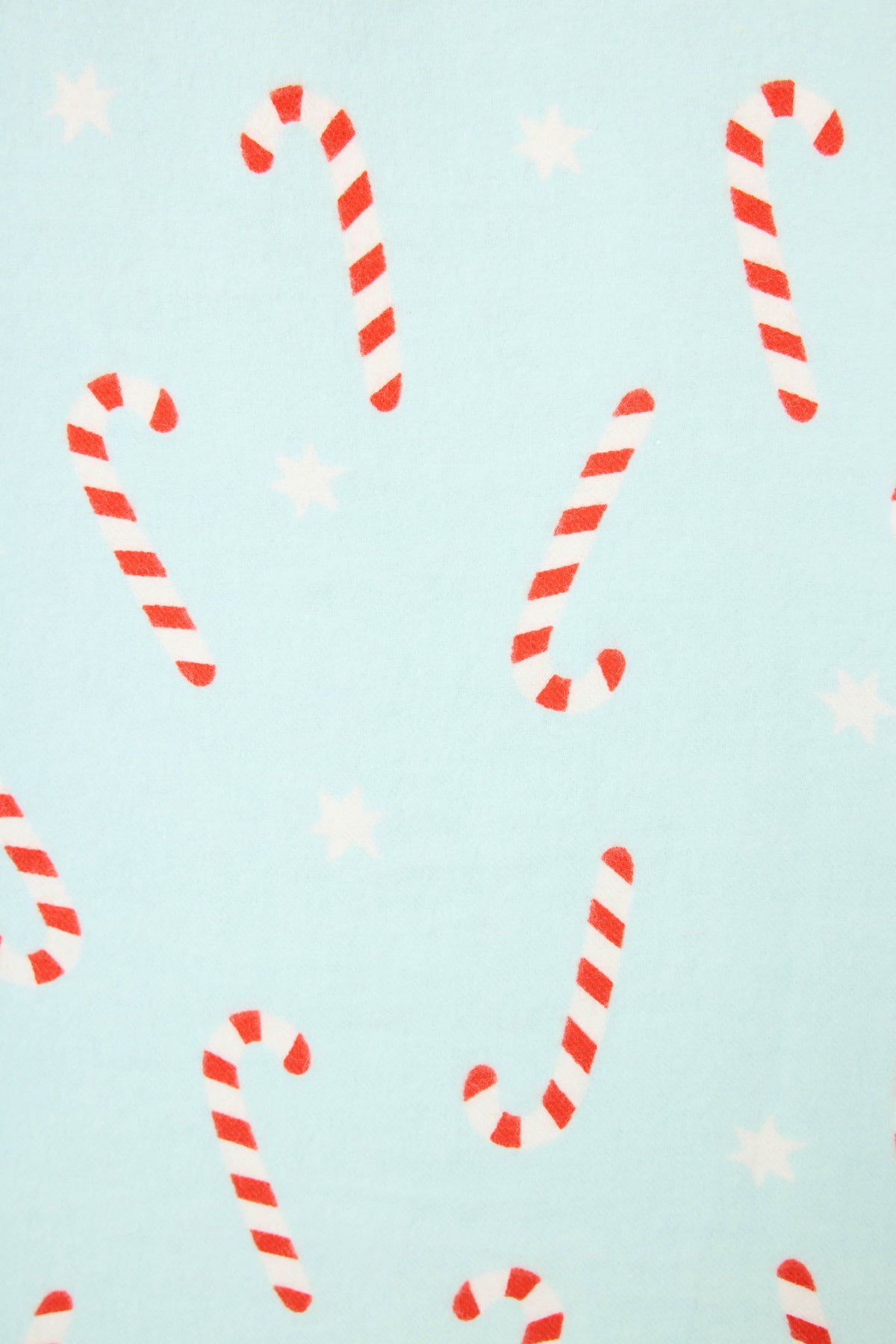 Bring the sweet to the season in this light aqua cotton flannel pajama set, sprinkled with candy canes and stars. This three-piece design includes a button-up top, straight-leg drawstring pants, and a matching eye mask—made for festive mornings, holiday movie marathons, and cozy nights in.