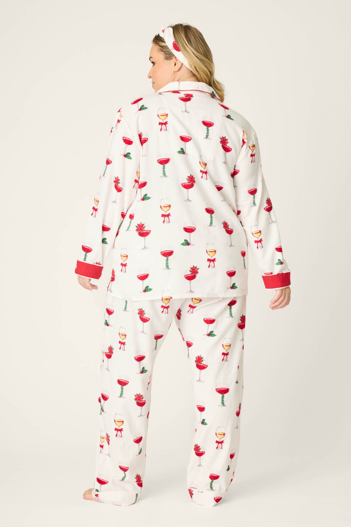 Women’s plus size ivory cotton flannel 3-piece pajama set with holiday wine glass and poinsettia print, button-down top with red piping, relaxed drawstring pants, and matching headband.