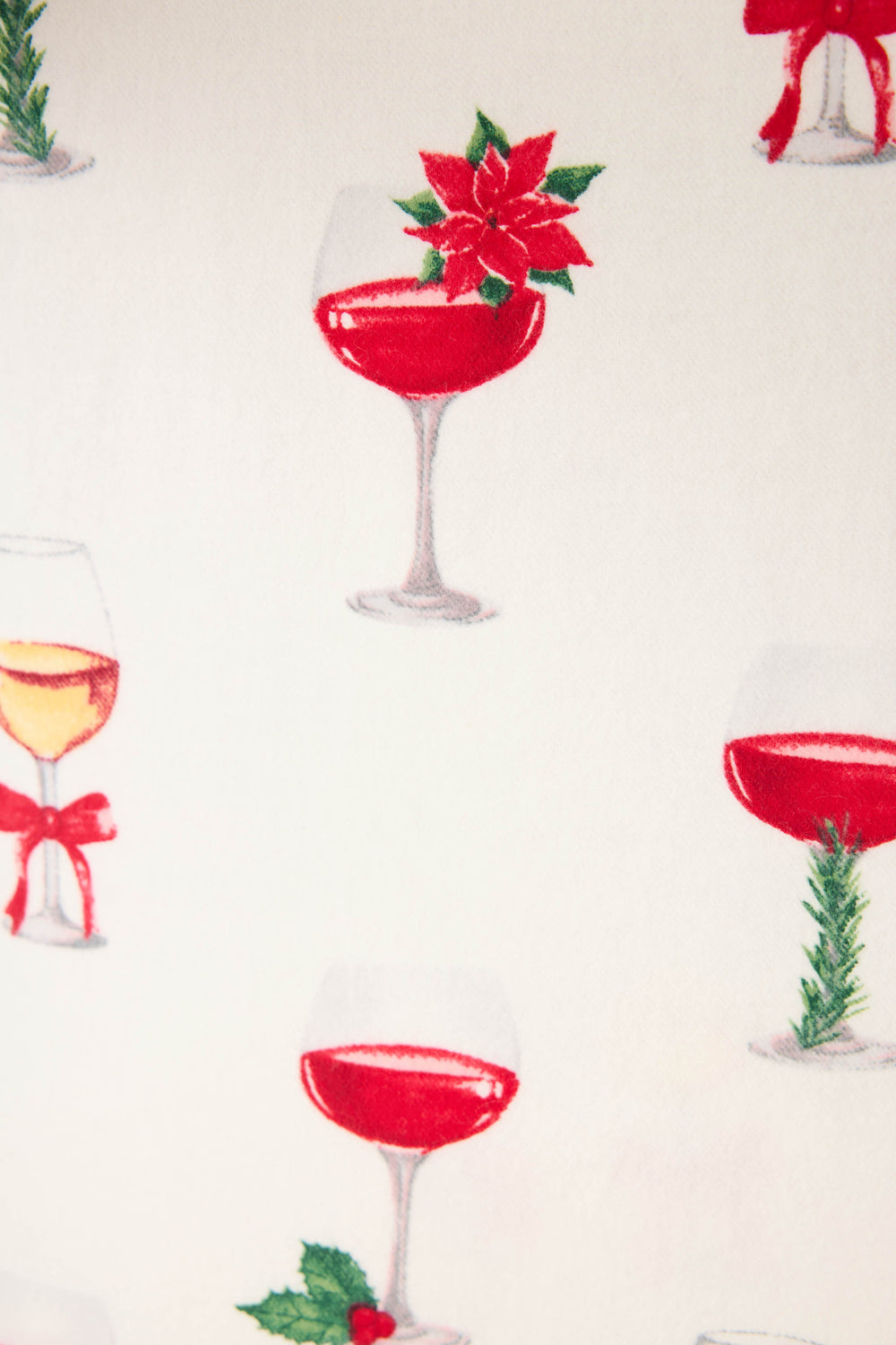 Raise a glass to cozy season in this ivory cotton flannel pajama set, patterned with festive wine glasses topped with poinsettias, bows, and sprigs of holly. This plus-size three-piece design includes a button-down top finished with red piping, relaxed drawstring pants, and a matching headband—perfect for holiday happy hours, wrapping marathons, and fireside lounging.