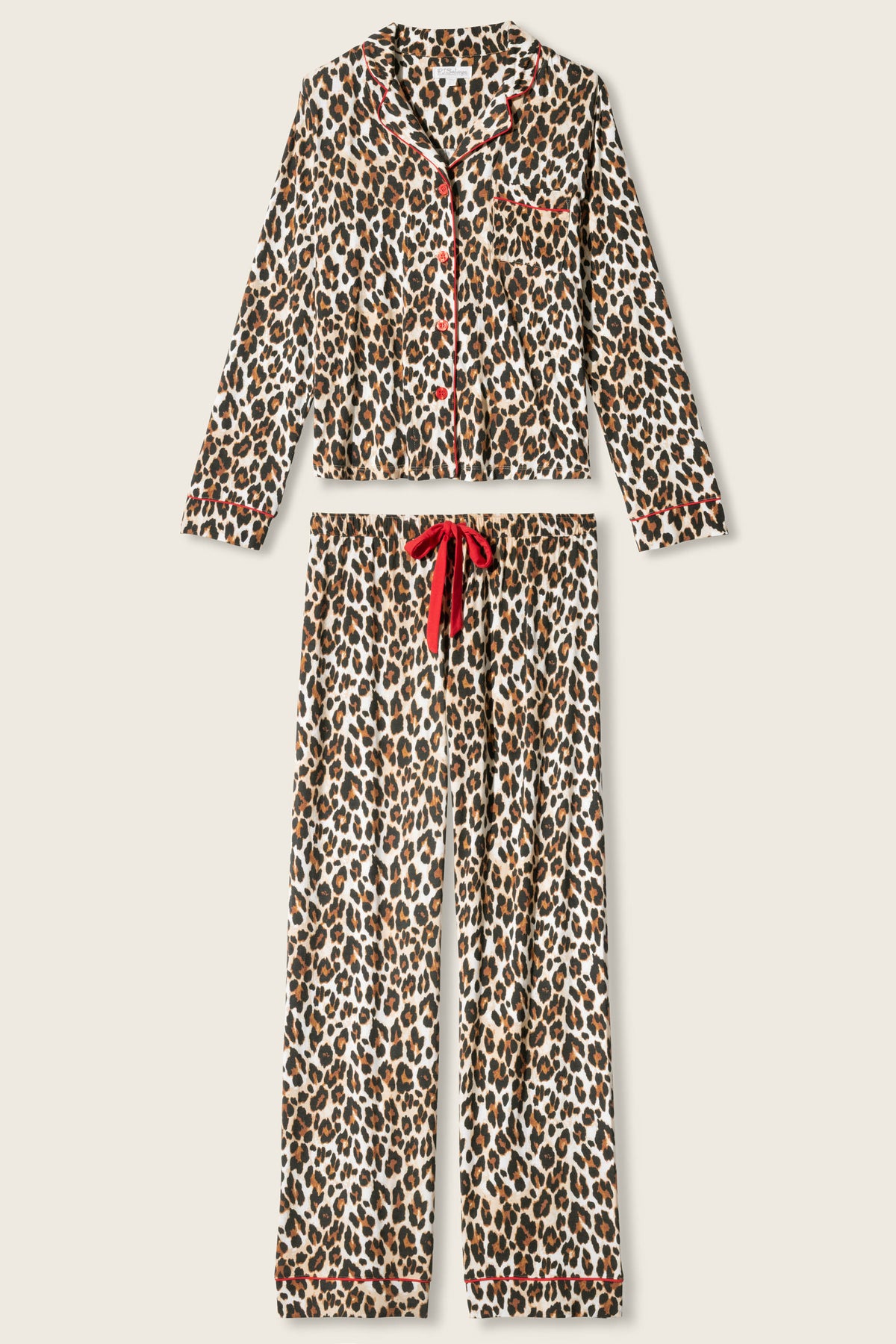 Women’s modal jersey pajama set in leopard print with button-down top, red piping trim, and straight-leg drawstring pants.