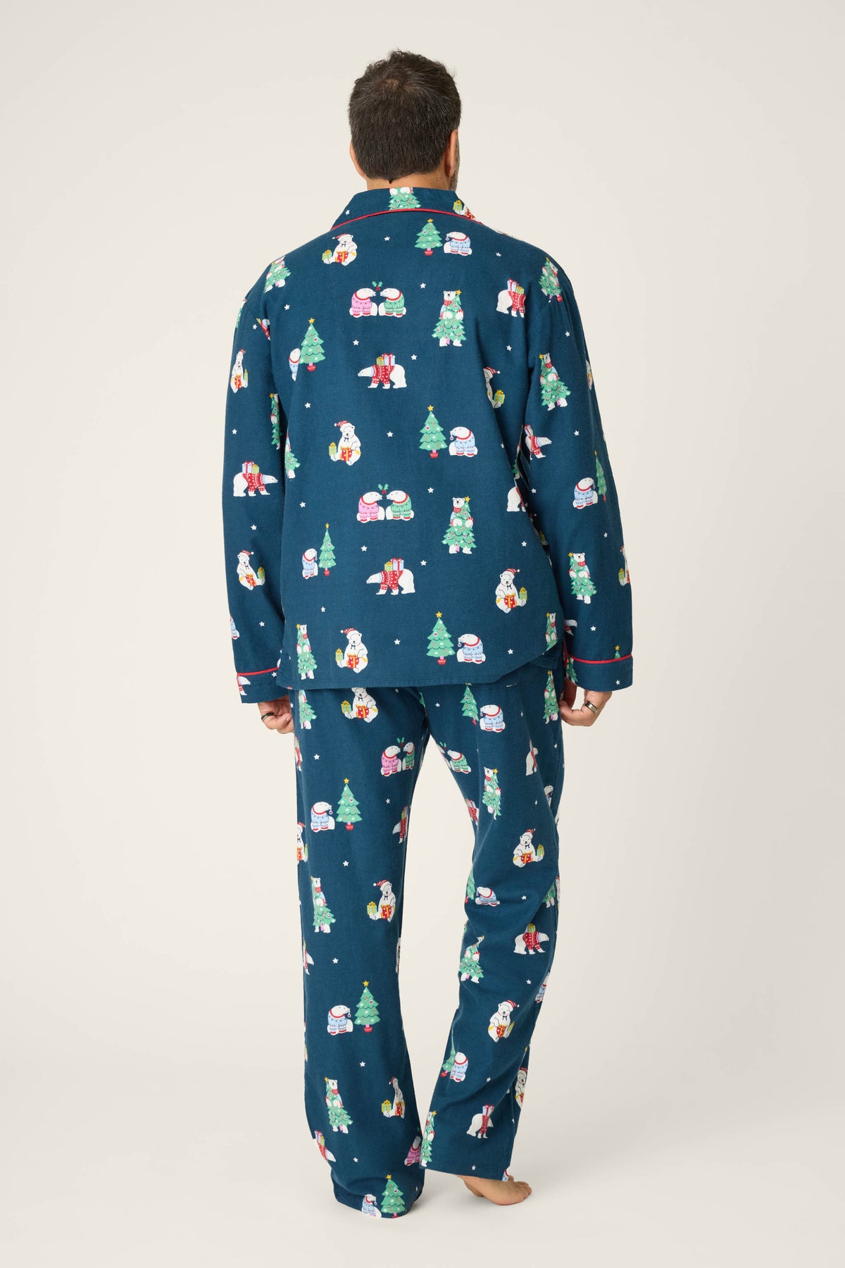 Men’s navy cotton flannel pajama set with allover bear print, button-down top, and drawstring pants.