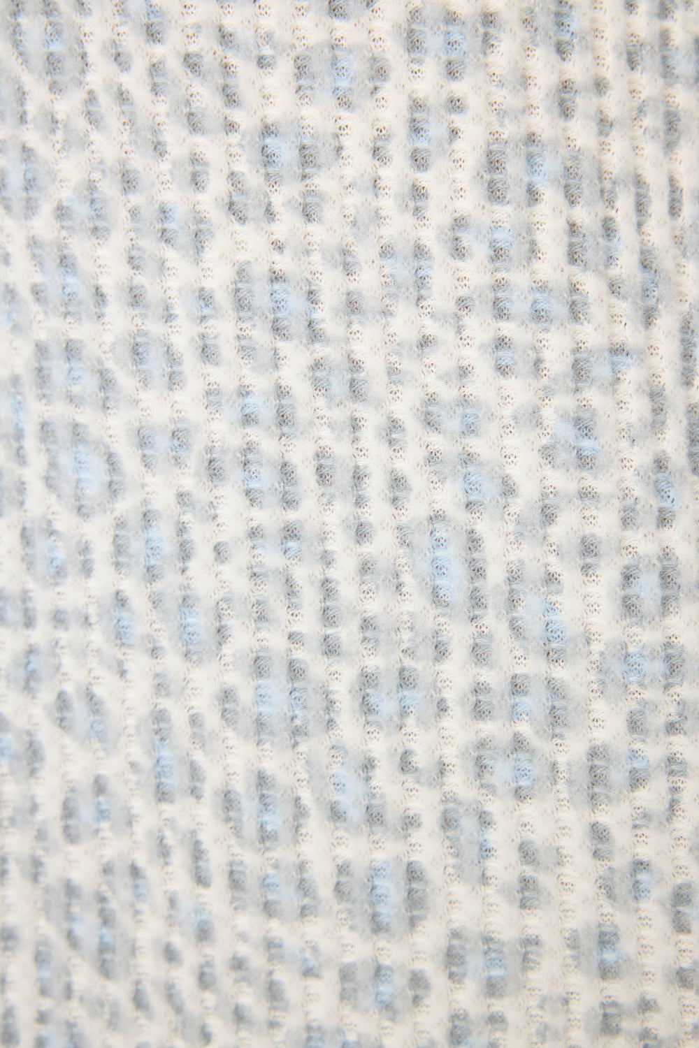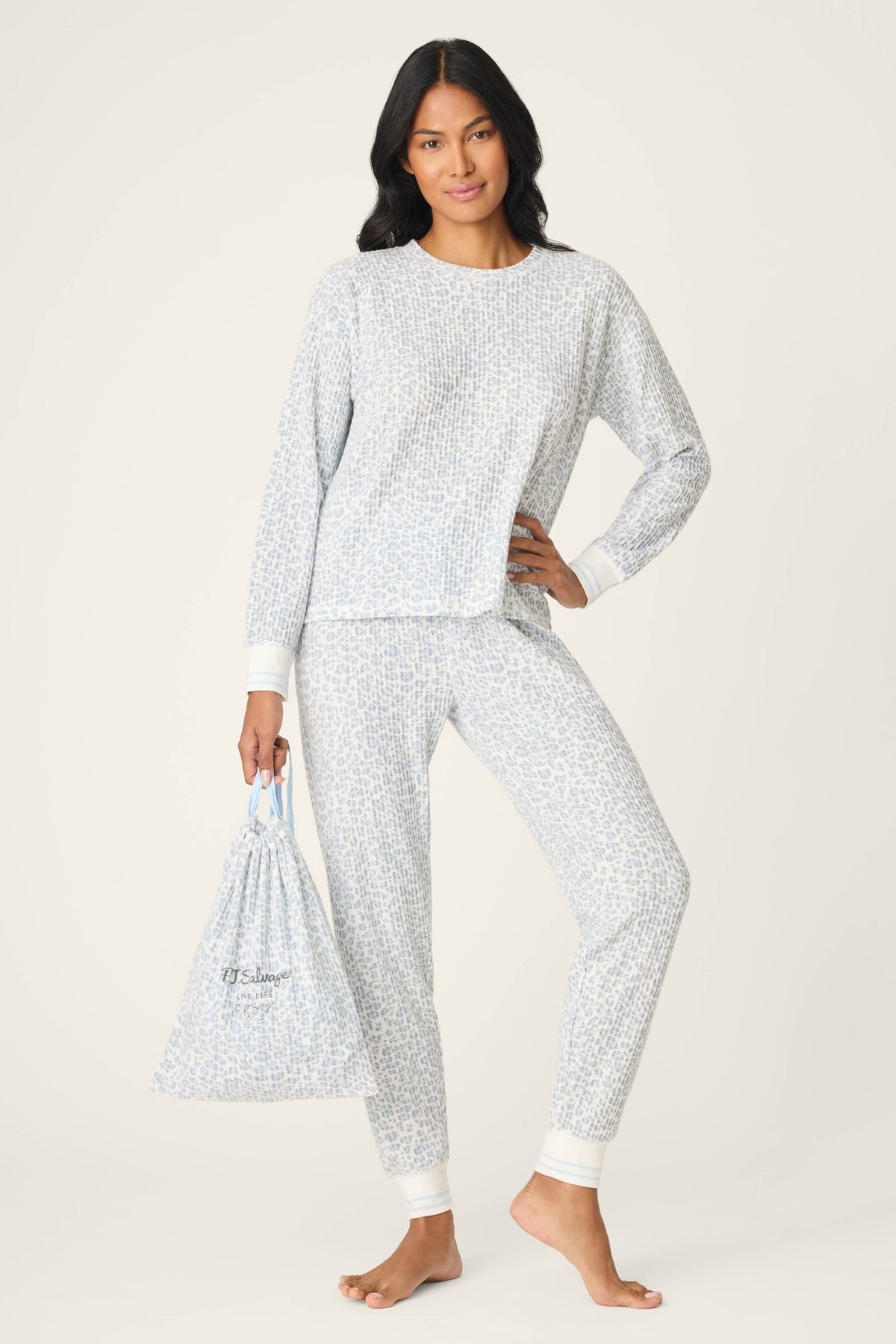 Women’s ivory 3-piece pajama set in thermal velour with grey leopard print, long-sleeve top, drawstring pants, and matching bag.
