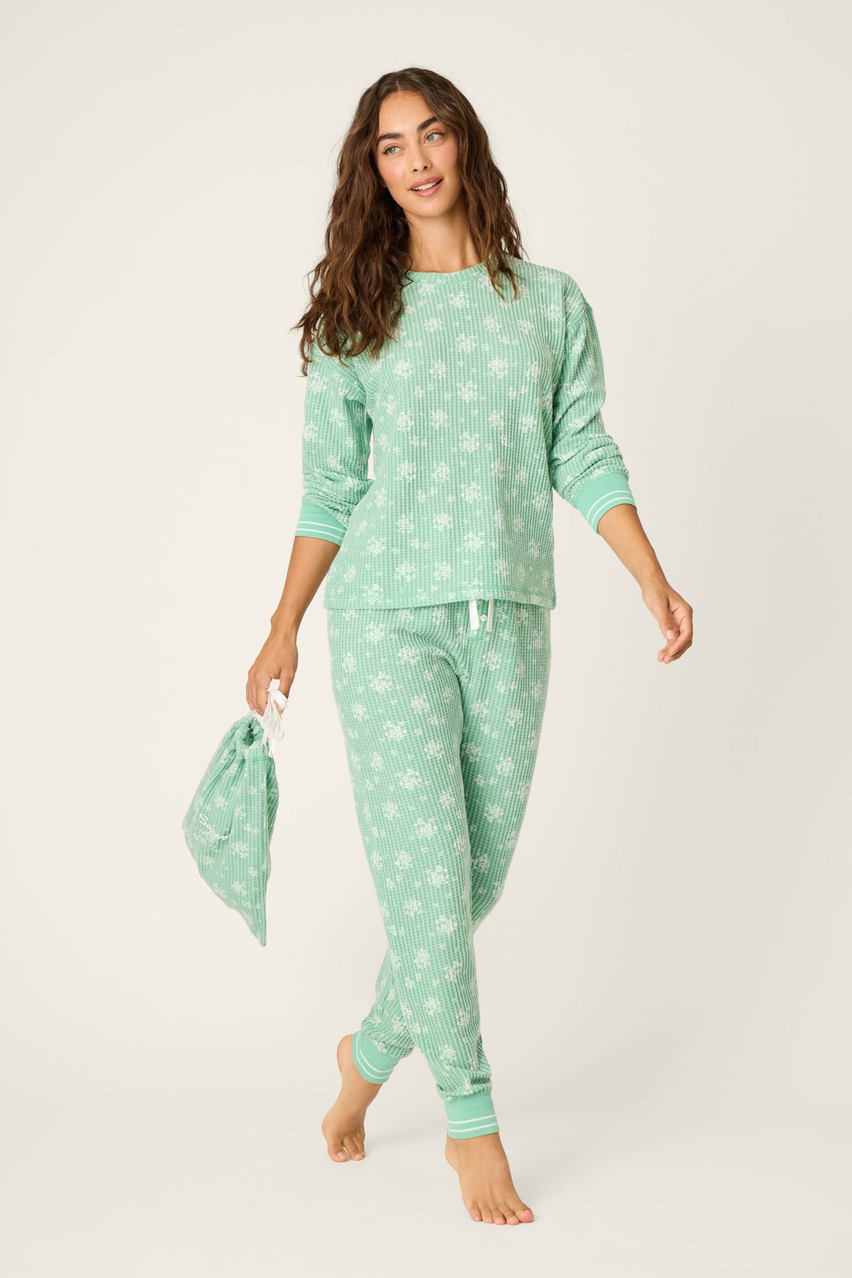 A woman with long brown hair wears the P.J. Salvage DTC Exclusive - SNOWFLAKE PJ SET 3 PIECE GIFT SET in light green with a white pattern, barefoot and holding a matching drawstring bag against a plain light background.