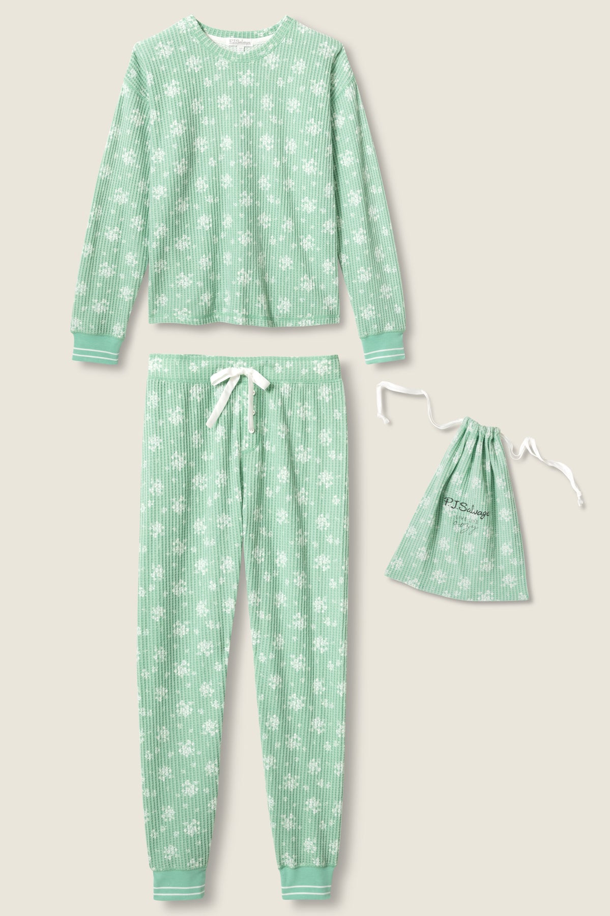 A person models the P.J. Salvage DTC Exclusive - SNOWFLAKE PJ SET 3 PIECE GIFT SET, featuring a matching green textured pajama set with small white floral patterns, smiling and posing against a plain background.