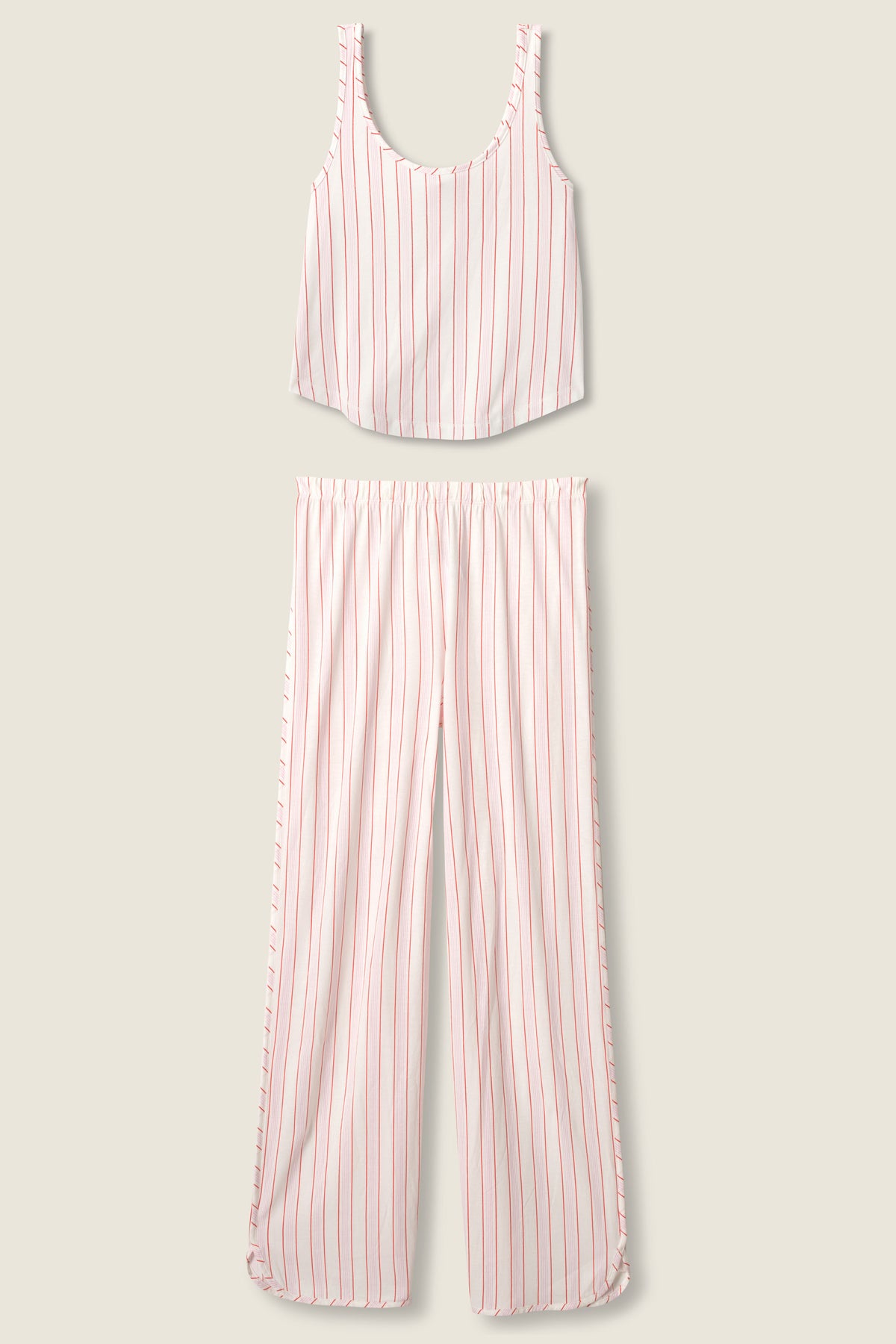 Ivory, red, and pink stripes bring a playful twist to this striped two-piece pajama set. Crafted in soft cotton-modal jersey, it includes a scoop-neck tank and matching open-leg pants for a look that’s as comfy as it is classic.